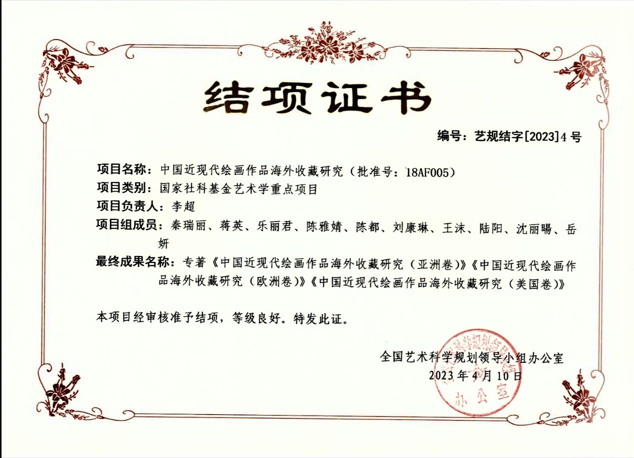 近日,由365完美体育上海美术学院李超教授主持的“十三五”国家社科基金艺术学重点项目《中国近现代绘画作品海外收藏研究》(批准号:18AF005),经全国艺术科学规划领导小组审核,以“良好”等级通过结项验收。