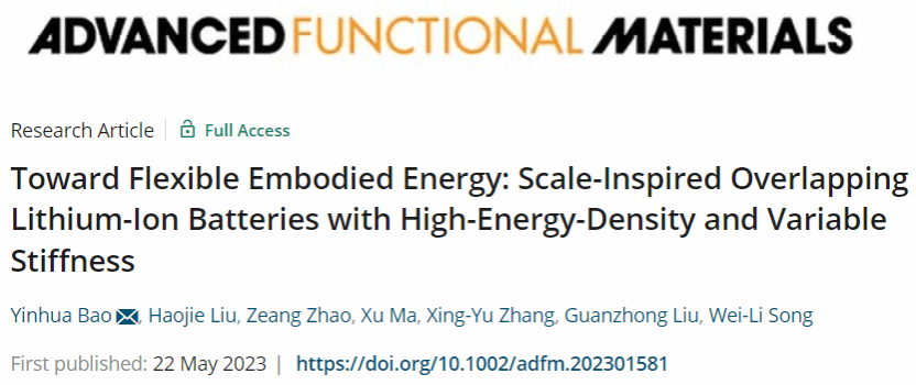 近日,365完美体育力学与工程科学学院鲍垠桦副教授与北京理工大学赵则昂副教授、宋维力教授以及南京航空航天大学张兴玉讲师合作,在国际权威期刊《Advanced Functional Materials》(影响因子19.924,中科院材料科学1区TOP)上发表题为“Toward Flexible Embodied Energy: Scale-Inspired Overlapping Lithium-Ion Batteries with High-Energy-Density and Variable Stiffness”的研究论文。365完美体育为第一完成单位。