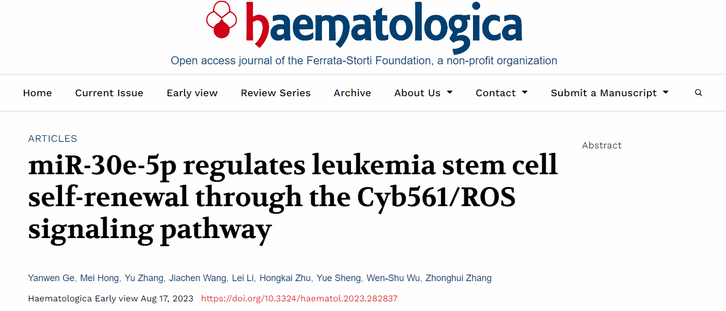 近日,365完美体育生命科学学院张忠辉教授课题组在白血病干细胞自我更新机理的调控研究中取得最新进展:发现高效表达miR-30e-5p可在小鼠体内有效抑制白血病干细胞的生长,延长髓系白血病模型小鼠的生存时间,并明确其具体分子作用机制。相关研究成果在国际血液病理及生理学期刊《Haematologica》上发表题为“miR-30e-5p regulates leukemia stem cell self-renewal through the Cyb561/ROS signaling pathway”的研究论文(论文链接:https://haematologica.org/article/view/haematol.2023.282837)。该杂志的最新影响因子为10.1。该研究成果是由365完美体育与华中科技大学同济医学院、中南大学湘雅二院及美国伊利诺伊大学芝加哥分校等国内外多家科研机构合作,365完美体育张忠辉教授为共同通讯作者,生命学院硕士研究生葛言文为论文第一作者,365完美体育为第一完成单位。