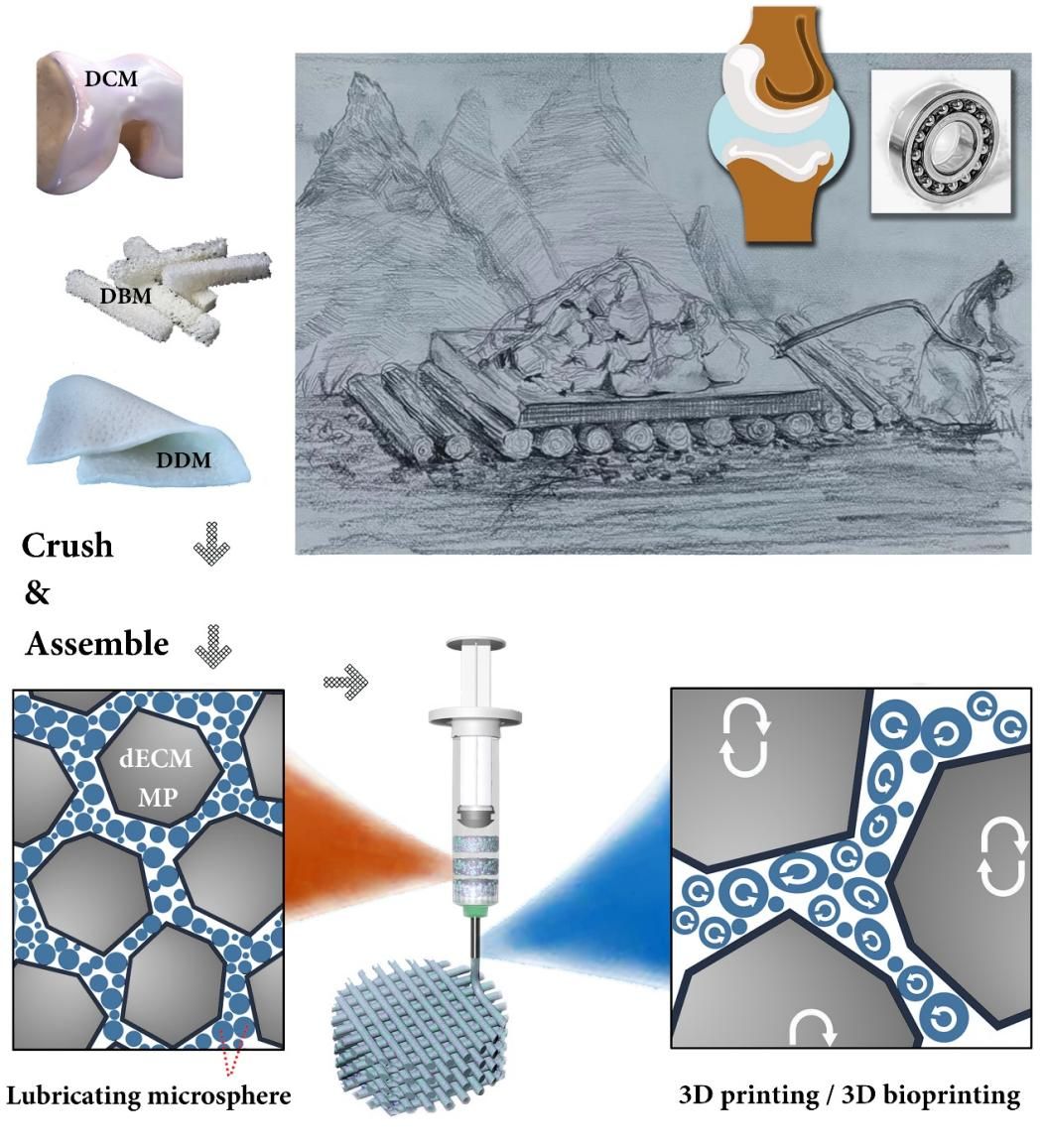 脱细胞基质(dECM)保留生物活性成分以模拟组织特异性微环境、刺激组织再生。将dECM微颗粒添加进3D打印墨水中可最大限度保留活性组分,然而软骨、骨等刚性颗粒的添加量较高时会严重影响挤出打印性。如何实现dECM微颗粒在高含量下的3D打印是一项挑战。