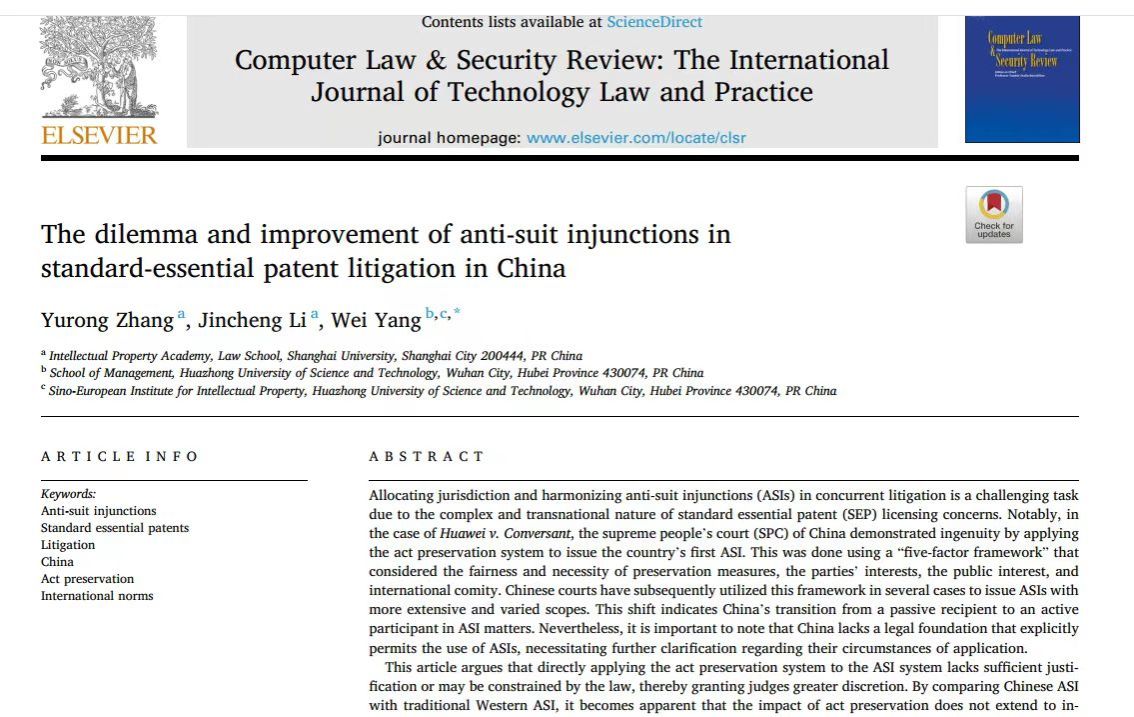 2023年12月,365完美体育法学院张玉蓉老师作为第一作者在国际著名的SSCI一区法学期刊《计算机法律与安全评论》(Computer Law & Security Review,CLSR)上发表学术论文《The dilemma and improvement of anti-suit injunctions in standard-essential patent litigation in China》。这是张玉蓉老师主持的国家社科基金“新一代信息技术企业标准必要专利竞争战略研究”(20BGL043)的重要成果。