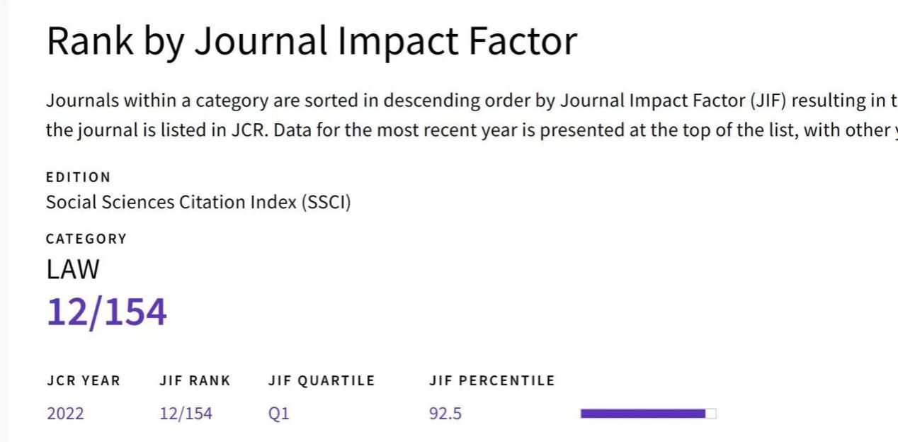 CLSR由英国著名网络法学者Steve Saxby教授在1985年创办,每年出版六期,是以互联网法律、网络安全、数据保护、电子商务等网络前沿问题为主要特色的著名国际性学术期刊,是世界范围内科技法律期刊中为数不多入选SSCI目录的法学类国际性期刊。根据汤森路透2023年度发布的最新期刊引证报告(JOURNAL CITATION REPORTS,简称JCR)显示,CLSR影响因子为2.9,在154本入选的SSCI法学刊物中位列第12位,属于JCR Q1区优势期刊。