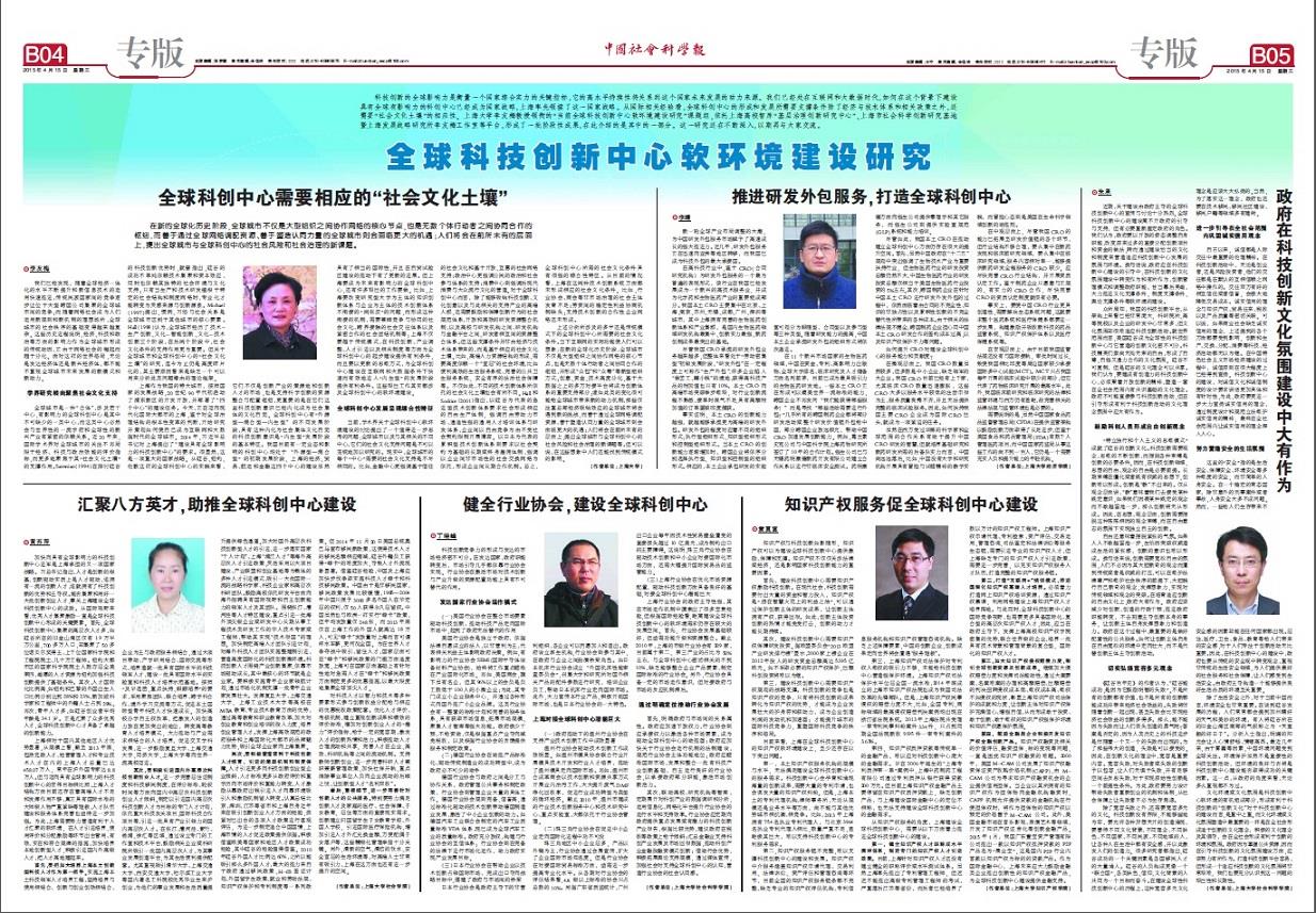 日前,课题组第一批成果已于2015年4月15日出版的《中国社会科学报》上刊登。该批成果从培植社会文化土壤、推进研发外包服务、培育与引进创新人才、健全行业协会、完善知识产权服务以及政府在创新文化氛围建设中的责任等角度,多维的阐释了全球科技创新中心软环境建设的相关问题。