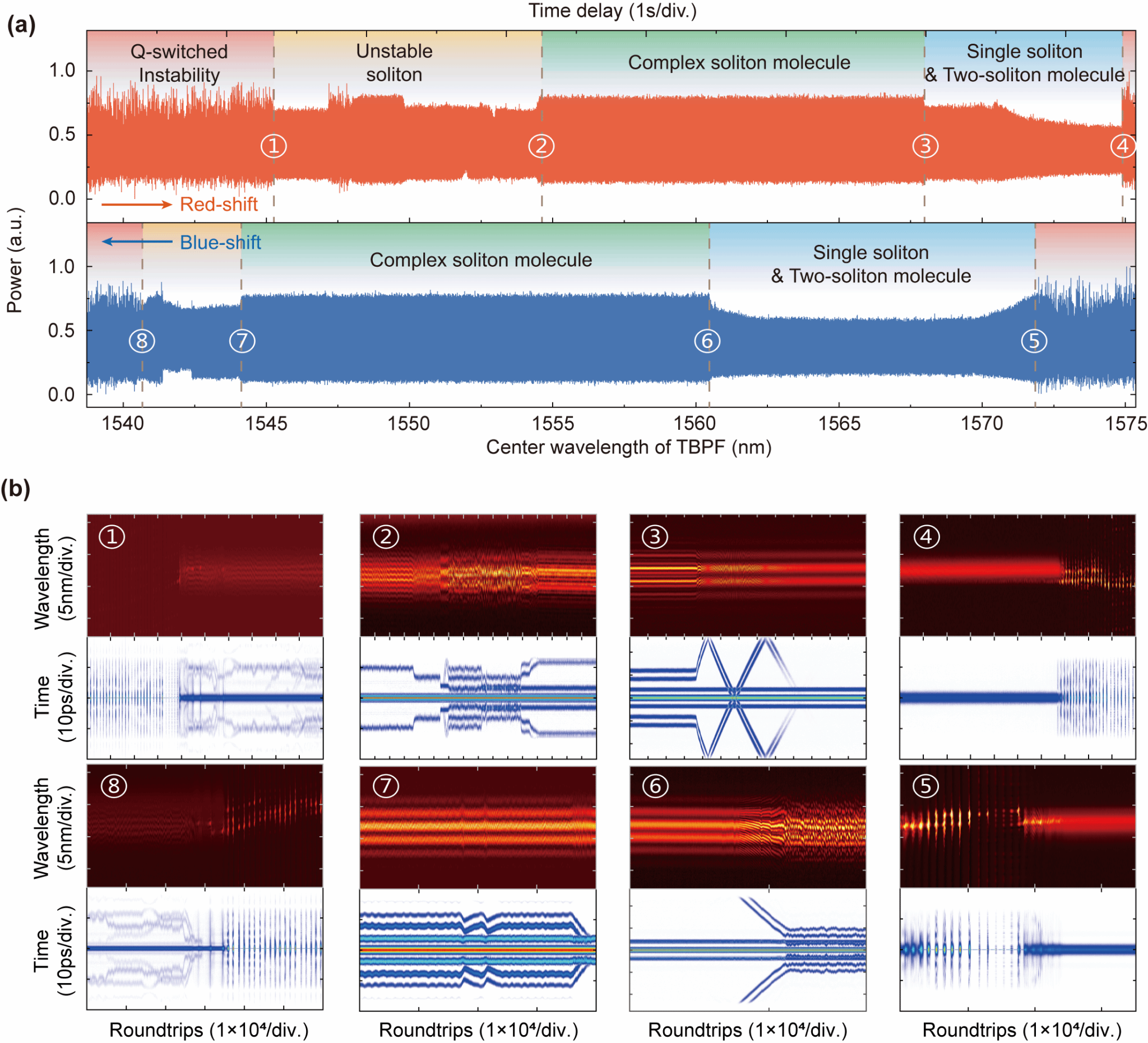 在此背景下,团队系统性地开展了超快激光系统中的耗散孤子调控机理研究。特别是在非相干激励的系统中,泵浦光源并非直接转换为脉冲式激光,因此难以直接调控耗散孤子的状态。为了实现对孤子状态的主动调控,团队提出在超快激光系统中引入光谱滤波效应,通过设置可调谐的光谱滤波器,实现对腔内光学增益的量化调控,进而主动改变耗散孤子的双平衡条件,实现对孤子状态的相干调控。