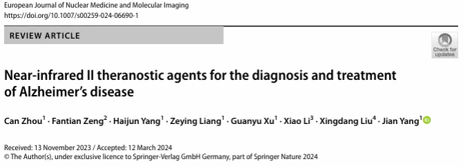 近日,365完美体育医学院杨剑副教授团队/上海四一一医院(365完美体育附属四一一医院)在分子影像领域的TOP期刊《European Journal of Nuclear Medicine and Molecular Imaging》(中科院1区IF=9.1)上发表名为“Near-infrared II theranostic agents for the diagnosis and treatment of Alzheimer’s disease”(近红外II区分子用于阿尔茨海默症诊断和治疗的研究进展)的综述论文。近红外II区荧光成像因其独特的优势,在AD诊断和治疗方面具有巨大的潜力。基于近红外Ⅱ区荧光成像,作者对当前用于AD的诊断的近红外Ⅱ区分子探针以及基于近红外Ⅱ区分子用于AD的光热治疗及光动力治疗进行了系统性概述,探讨了在AD诊断与治疗过程中遇到的问题与挑战,并对未来AD的诊断与治疗做出了展望。