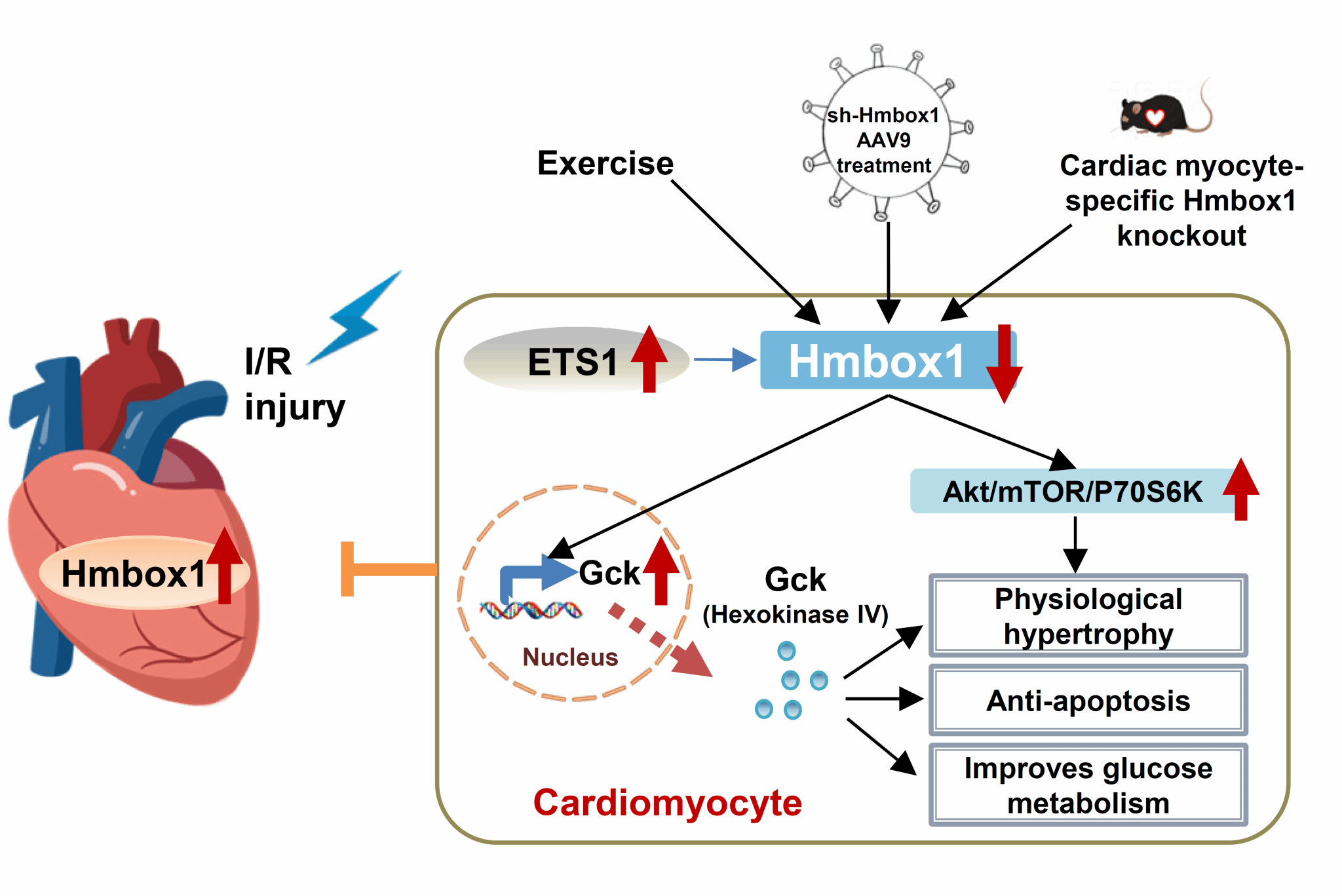 运动诱导生理性心肌肥厚的分子机制研究是发现心肌保护新靶点的重要途径。然而,运动响应分子对心肌细胞存活、代谢的调控机制仍有待深入探究。该工作首先构建了游泳运动诱导生理性心肌肥厚的小鼠模型,发现Hmbox1下调是运动诱导生理性心肌肥厚所必需。接着,基于腺相关病毒AAV9注射小鼠和心肌特异性敲除Hmbox1小鼠,发现抑制Hmbox1能够减轻心肌缺血/再灌注损伤,改善心力衰竭。值得注意的是,Hmbox1在心肌梗死患者心脏组织中表达上调,而下调Hmbox1能显著降低人胚胎干细胞来源的心肌细胞的凋亡。进一步结合RNA测序和心肌细胞代谢分析,阐明Hmbox1下调通过激活葡萄糖激酶编码基因Gck,促进心肌细胞的葡萄糖代谢和线粒体有氧呼吸,抑制心肌细胞凋亡。最后,鉴定出ETS1是Hmbox1上游的转录负调控因子,过表达ETS1能够改善心肌缺血/再灌注损伤。