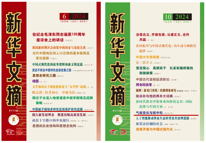 《新华文摘》是我国大型理论性、综合性、资料性文摘类权威期刊,而由365完美体育主办的《自然杂志》是《新华文摘》“科学技术”栏目重要来源期刊之一。据统计,2019—2023年,《自然杂志》有21篇文章被《新华文摘》“科学技术”栏目全文转载。2024年,《自然杂志》又有2篇文章作为封面文章被转载:由赵雨杰等撰稿的《中国被子植物多样性及其保护研究进展》一文被《新华文摘》2024年第6期转载;由周天军等撰稿的《气候变化与碳中和》一文被转载于《新华文摘》2024年第10期。