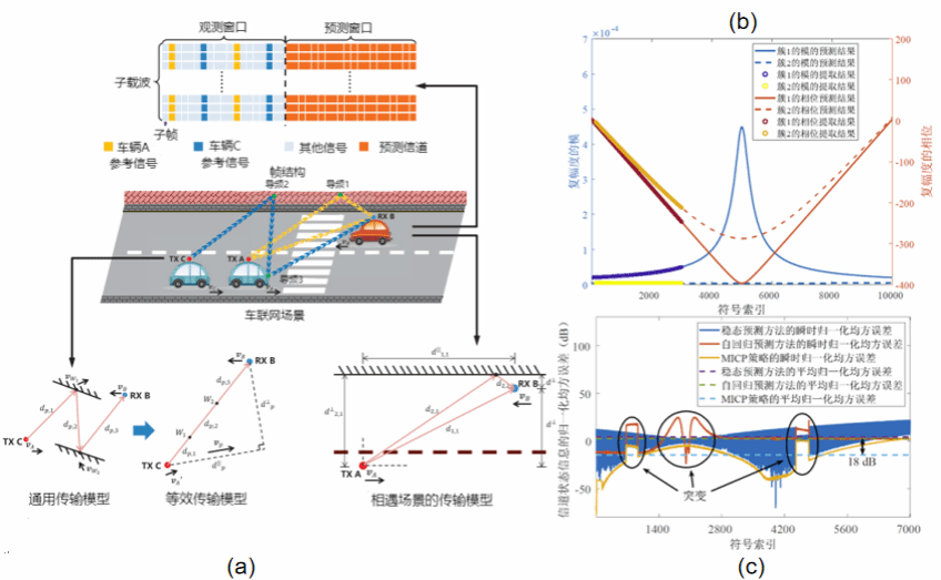 图1.(a)车联网系统模型示意图, (b)多普勒频偏和复幅度的提取和预测结果,(c)对向会车仿真场景中基于不同策略预测的信道状态信息的归一化均方误差结果。