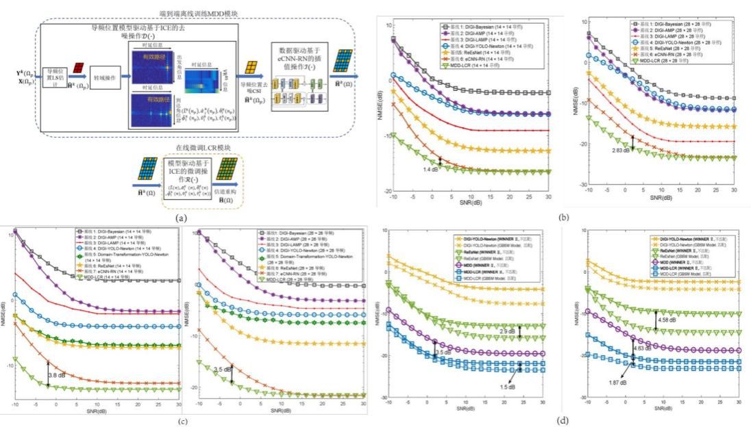 (a)数据-模型双驱动MDD-LCR非平稳信道估计统一框架;(b) 在基站天线数为16的空域平稳环境下,MDD-LCR方案与传统基线算法的NMSE与SNR性能对比(14×14和28×28导频配置);(c) 在基站天线数为64的空域非平稳环境下,MDD-LCR方案与传统基线算法的NMSE与SNR性能对比(14×14和28×28导频配置);(d) 在不匹配的空域平稳和非平稳场景下,MDD-LCR方案、无LCR模块的MDD、ReEsNet以及传统DIGI-YOLO-Newton方法的NMSE与SNR性能对比