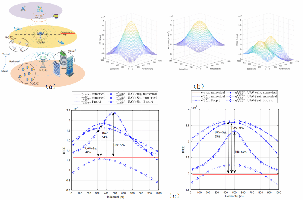 (a)6G网络场景示意图(b)能量效率,区域能量效率以及集成相对能效的空间分布比较(c) 在非均匀地面流量(左)和非均匀SAGIN流量(右)下,RIS以及SAGIN技术的IREE性能