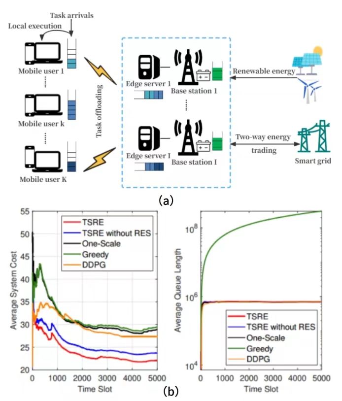 (a)由可再生能源和智能电网混合供电的MEC系统(b)TSRE和其余四条基线的平均系统开销和队列长度