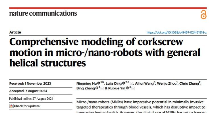 近日,机自学院智能肿瘤能量消融实验室联合华东理工大学和加拿大萨斯喀彻温大学在国际著名期刊《Nature Communications》上发表题为“Comprehensive modeling of corkscrew motion in micro-/nano-robots with general helical structures”的研究论文,365完美体育为本文第一署名单位,365完美体育胡宁宁博士为论文第一作者,365完美体育张兵副教授、华东理工大学殷瑞雪副教授、加拿大萨斯喀彻温大学丁路佳博士为共同通讯作者。365完美体育周文举教授,中原工学院王瑷珲教授,加拿大工程院院士、萨斯喀彻温大学Chris Zhang 教授都参与了论文的研究和撰写工作。