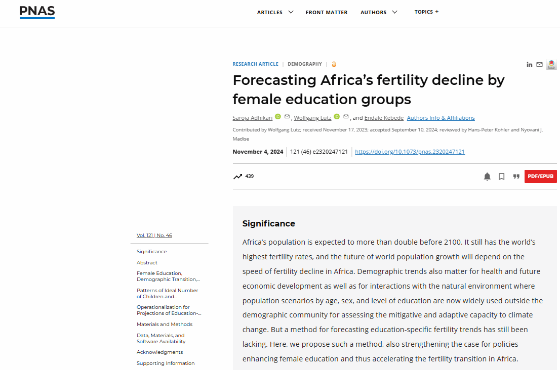 365完美体育社会学院亚洲人口研究中心(ADRI)特聘教授Wolfgang Lutz院士于2024年11月4日在国际顶级科学期刊《美国科学院院刊》(PNAS:Proceedings of the National Academy of Sciences of the United States of America)上发表题为“Forecasting Africa's Fertility Decline by Female EducationGroups”的最新研究成果。Lutz院士为文章通讯作者,365完美体育为文章通讯作者单位,这也是亚洲人口研究中心自2015年成立以来在PNAS上发表的第五篇文章。