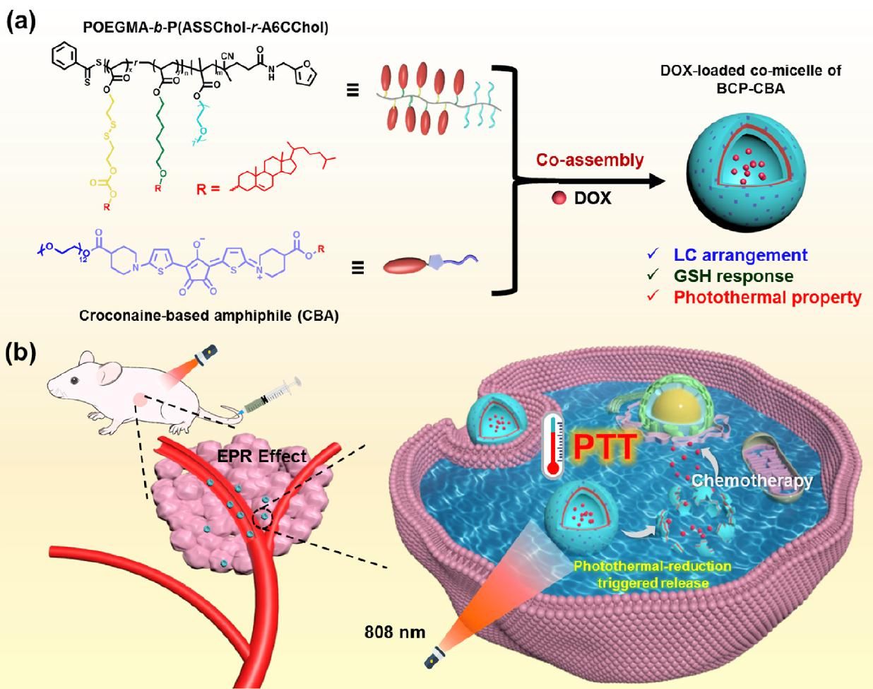 图1、(a) 嵌段聚合物和光热双亲分子的结构式及光热-还原双响应载药共胶束的制备示意图; (b) 光热-化疗协同治疗示意图。