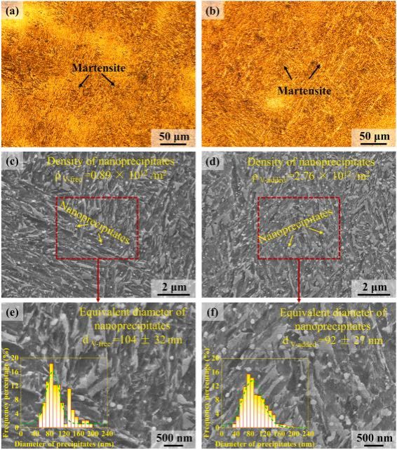 V-free钢和V-added的力学性能:(a)冲击功和硬度;(b)应力-应变曲线