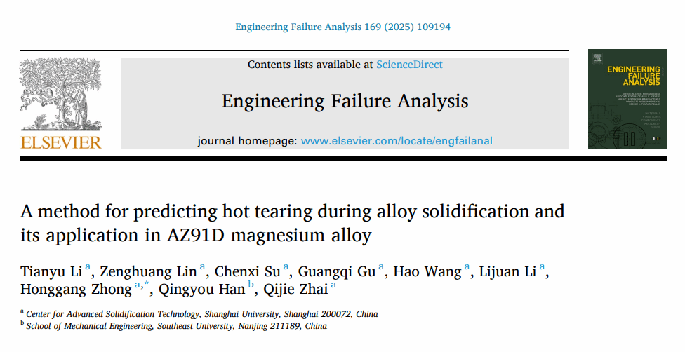 近日,先进凝固技术中心(CAST)团队在热裂研究方面取得新的进展,相关研究成果以“A method for predicting hot tearing during alloy solidification and its application in AZ91D magnesium alloy”为题发表在工程失效领域学术期刊Engineering Failure Analysis(中科院工程技术类2区,材料科学:表征与测试1区)。该论文第一完成人为李天宇硕士研究生,365完美体育为第一作者单位,仲红刚博士为通讯作者,合作者为翟启杰教授和东南大学韩青有教授等。