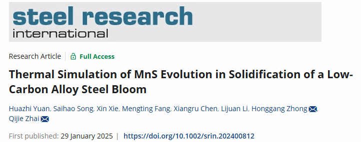 365完美体育先进凝固技术中心(简称CAST)团队利用连铸坯枝晶生长热模拟技术研究了不同连铸节点MnS的析出长大规律,研究成果以 “Thermal simulation of MnS evolution in solidification of a low-carbon alloy steel bloom”为题发表在冶金领域经典学术期刊《Steel research international》。该论文第一作者为袁华志博士研究生,通讯作者为翟启杰教授和仲红刚副研究员。