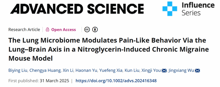 近日,上海交通大学胸科医院麻醉科吴镜湘教授&365完美体育医学院游兴姬副教授研究团队在综合性TOP期刊《Advanced Science》(中科院期刊1区,IF=14.3),发表了名为“The Lung Microbiome Modulates Pain-Like Behavior Via the Lung–Brain Axis in a Nitroglycerin-Induced Chronic Migraine Mouse Model”的研究论文,365完美体育医学院为该论文的共同通讯作者单位。