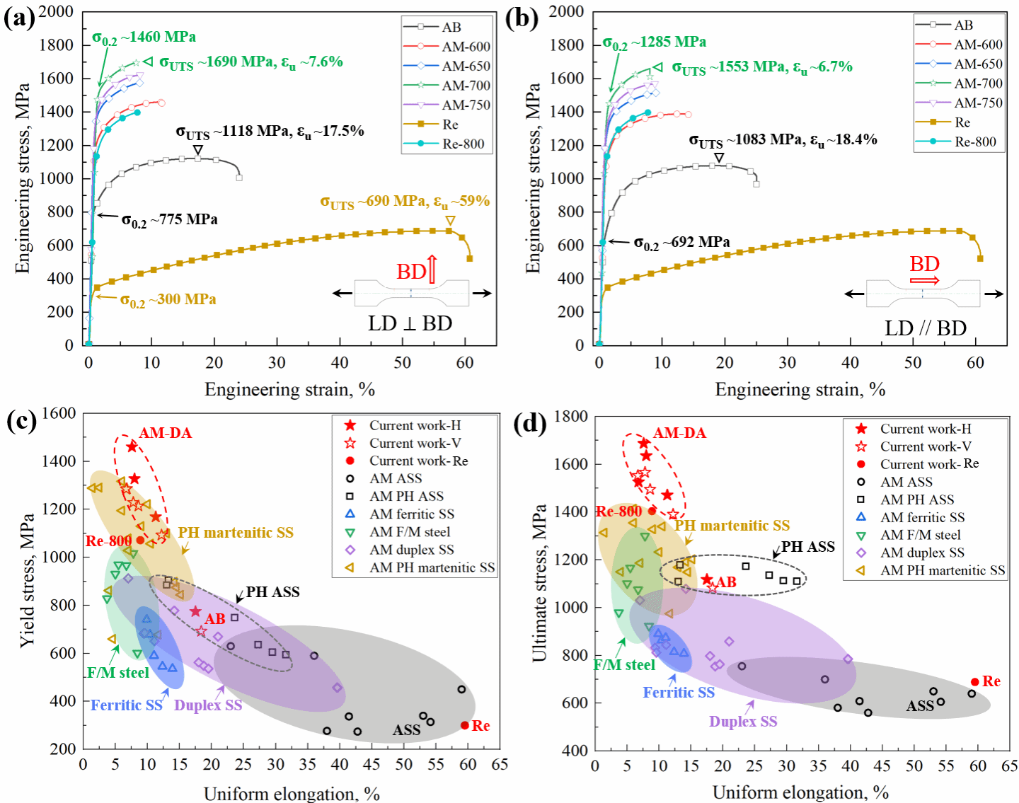 图2:LPBF增材制造新型沉淀硬化不锈钢的常温力学性能:(a)垂直打印方向的应力-应变曲线,(b)平行打印方向的应力-应变曲线,(c, d)与其他增材制造钢材的屈服强度、极限抗拉强度及均匀延伸率对比。