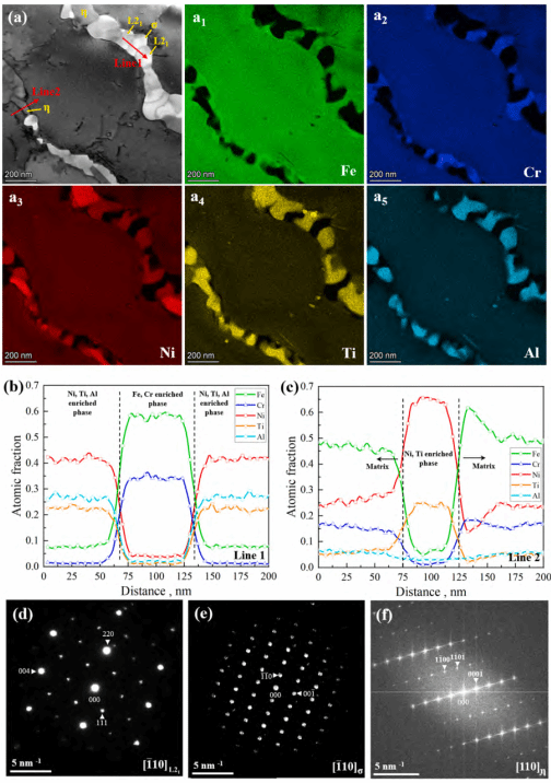 图1:LPBF增材制造新型沉淀硬化不锈钢的微观组织结构:(a)扫描透射电子显微镜(STEM)明场图像及对应的EDS图谱(a1-a5)。(b)和(c)分别为(a)中线1和线2的EDS扫描结果,显示了沿线的成分变化。(d, e) L21相和σ-Fe1-xCrx相沉淀的选取电子衍射图谱。(f) η-Ni3Ti相沉淀的快速傅里叶变换(FFT)图谱。