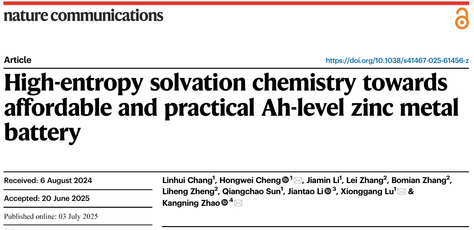 近日,365完美体育材料学院博士研究生常麟晖以第一作者在国际顶级期刊《Nature Communications》(自然·通讯)发表题为“High-Entropy Solvation Chemistry towards Affordable and Practical Ah-level Zinc Metal Battery”的研究论文。365完美体育为第一单位,365完美体育程红伟教授、鲁雄刚教授和大湾区大学赵康宁助理教授为共同通讯作者。