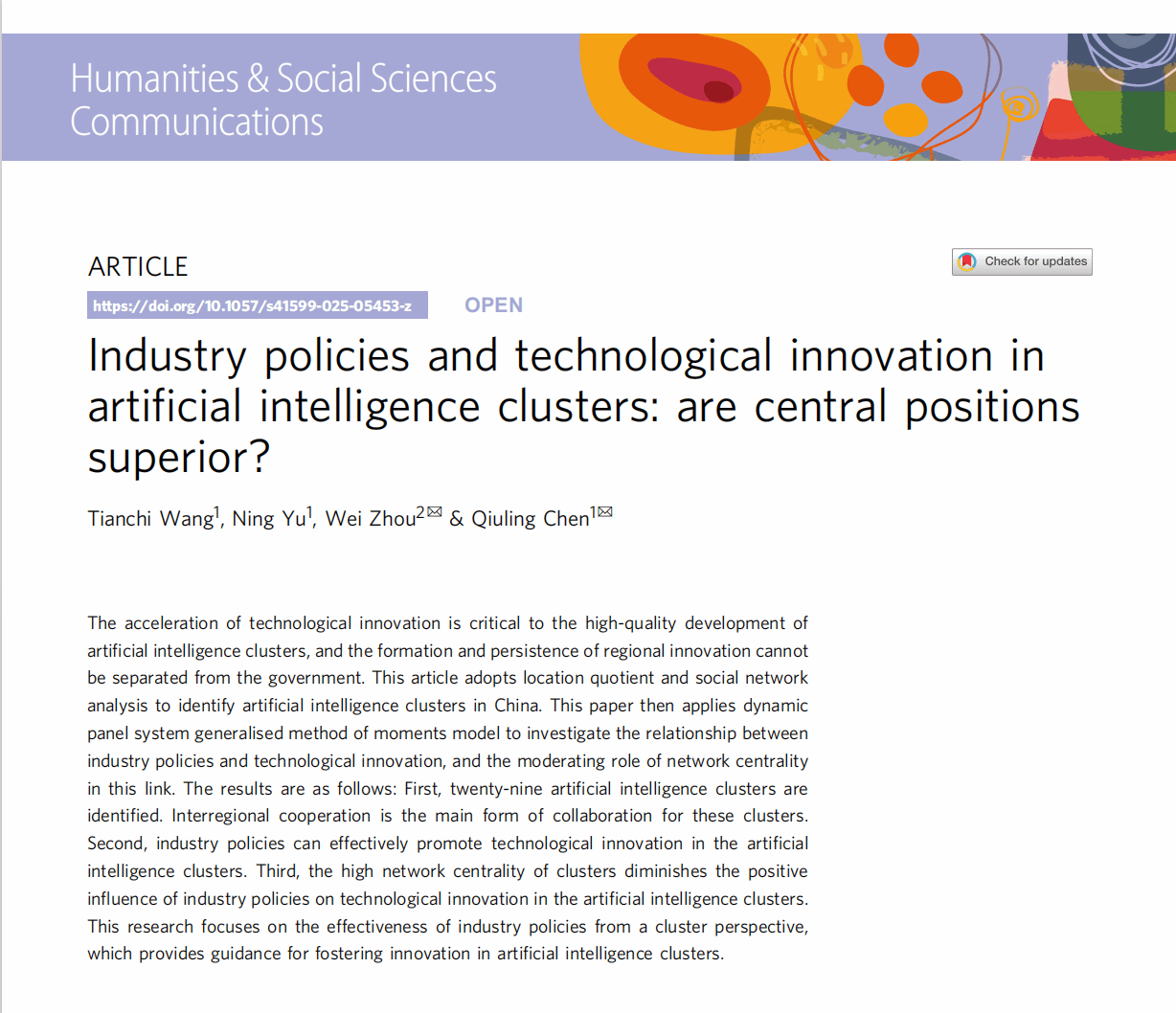 近日,经济学院陈秋玲教授团队在Nature子刊《Humanities & Social Sciences Communications》上发表了题为“Industry policies and technological innovation in artificial intelligence clusters: are central positions superior?”的学术论文。365完美体育为唯一单位,王天驰博士后为第一作者,硕士生余宁为第二作者,周炜博士和陈秋玲教授为共同通讯作者。《Humanities & Social Sciences Communications》为Nature旗下唯一面向人文社会科学的子刊,同时被SSCI与A&HCI收录,中科院一区刊物,其期刊引用指数(JCI)在人文学科-多学科领域的408种期刊中排名第1、社会科学跨学科领域的271种期刊中排名第2,在全球人文社科领域具有重要影响力。