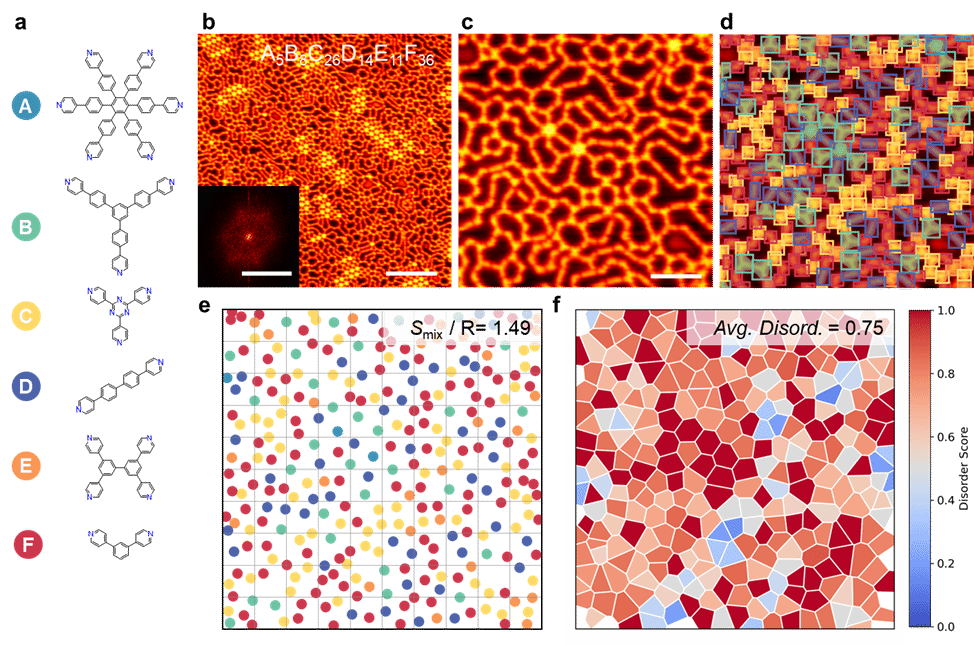 通过扫描隧道显微镜(STM)原位表征,研究人员揭示了不同组分分子在表面组装过程中呈现出的有序与无序相,团队利用机器学习方法对六组分分子网络的高分辨STM图像进行分析,首次实现了单分子识别和混合熵定量计算(如图2),并提出了一套表征分子网络“无序度”的新指标。进一步地,结合蒙特卡洛和分子动力学模拟,揭示了分子形状、对称性和配位数在决定网络结构稳定性及熵值中的关键作用。该研究表明,高熵分子网络不仅能够通过合理设计获得稳定的多组分混合态,还为理解和调控低维有机纳米结构的构筑提供了新思路。