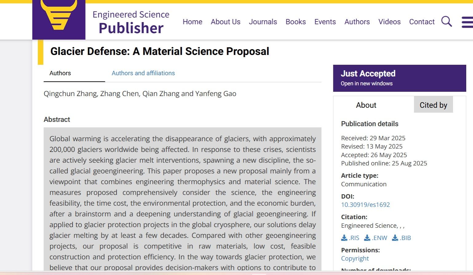 在此背景下,365完美体育材料科学与工程学院高彦峰教授团队展开深入研讨,从工程热物理角度系统分析了冰川融化的机理,并综合考量科学性、工程可行性、时间成本、环保性与经济性等多重因素,提出了一项可行的冰川保护新方案。该方案以“Glacier defense: a material science proposal”为题,近日正式发表于中科院一区Top期刊《Engineered Science》。该期刊聚焦工程与多学科交叉研究,在推动前沿理论突破与重大工程应用对接方面具有显著的学术影响力。