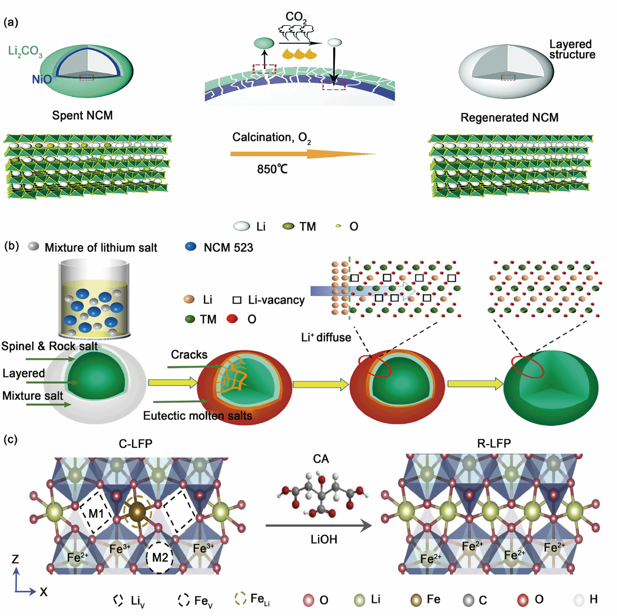直接再生是一种基于正极材料失效机制的新型回收策略,旨在通过结构修复与组分调控恢复其电化学性能,同时保持原有化学组成与宏观结构。LIBs的失效多源于循环过程中的晶体结构畸变与活性锂损失,层状结构材料(如LiCoO₂)尤为典型,常见问题包括层间塌陷、相变和金属离子溶出等。直接再生工艺主要包括脱锂、晶格修复和再锂化三个核心步骤,并通过表面包覆等后处理方式进一步提升材料的循环稳定性与电化学性能。目前,该技术已成功应用于LiFePO₄、LiCoO₂及三元材料(NCM)等多种典型正极的再生,修复方法涵盖固相烧结、共晶熔盐锂化、水热法、电化学还原及其他新兴绿色技术,展现出广阔的应用前景。