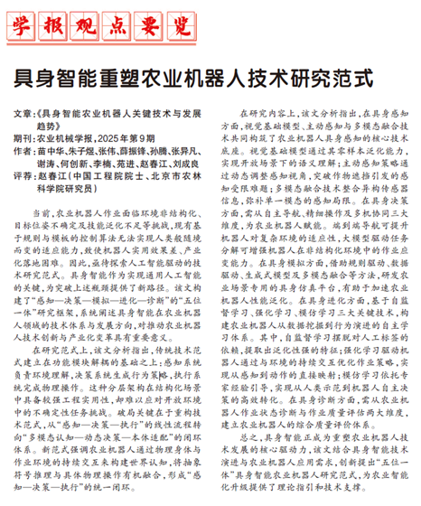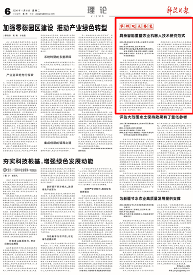 近日,机自学院苗中华教授团队发表于《农业机械学报》的论文《具身智能农业机器人关键技术与发展趋势》获得国家级权威媒体《科技日报》“学报观点要览”栏目的特别推介,充分彰显了机自学院服务国家重大战略需求、聚焦前沿核心技术攻关的选题成效。