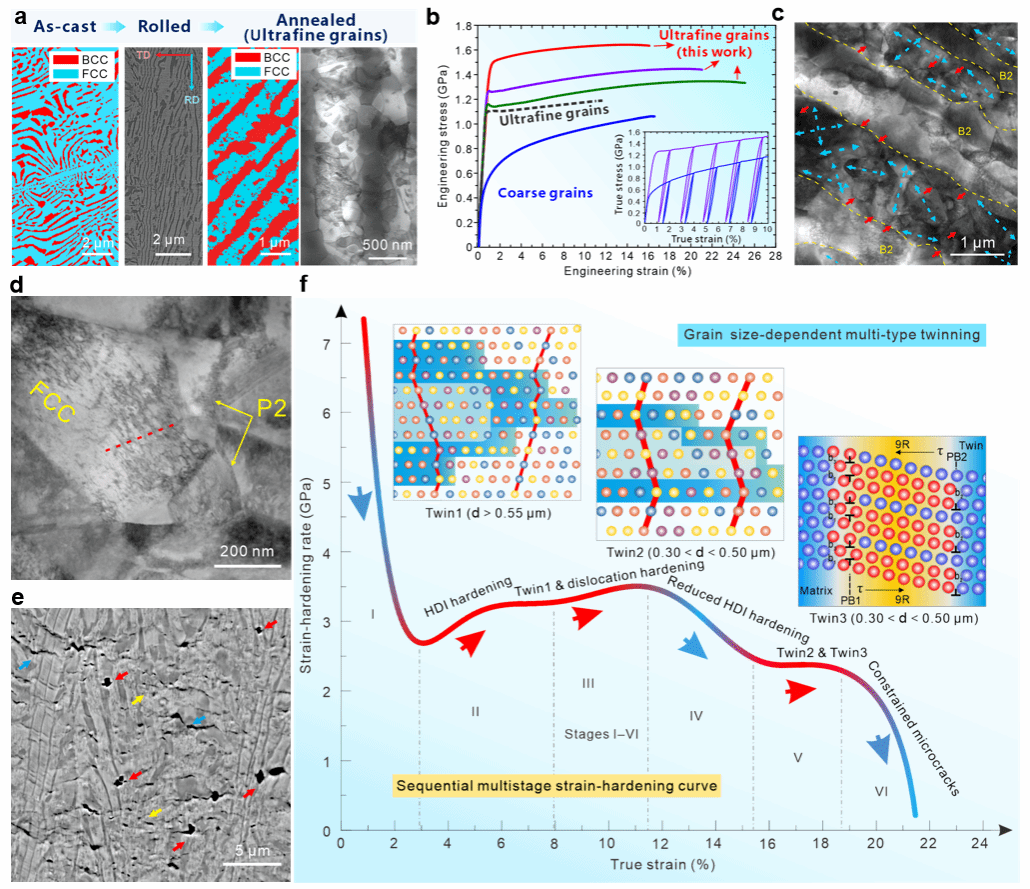 图3 微层片遗传工程制备的多级层片异质结构及多类型纳米孪生诱导的多阶段应变硬化