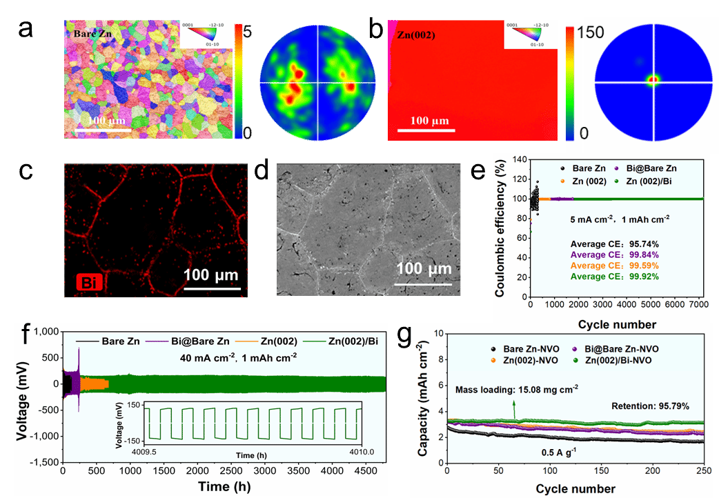 基于此,该论文提出了一种化学置换与热处理的协同策略,成功将金属Bi引入(002)织构锌的晶界中。(002)织构为Bi偏析提供能量和结构上有利的途径,而Bi填充则从化学上钝化、机械上强化了晶界,从而在循环过程中维持了织构特征。理论计算与实验证实,Bi的引入有效抑制了晶界副反应,降低了去溶剂化和成核势垒,增强了Zn2+传输动力学,促进了均匀的锌沉积,并在40 mA cm-2的超高电流密度下,Zn(002)/Bi对称电池实现了4800小时(约96000次循环)的超稳定循环,累计沉积容量高达96 Ah cm-2。匹配高负载正极(29.73 mg cm⁻⟡,N/P=4.18),在0.5 A g-1下循环200次后仍能保持87.57%的容量。这项研究通过协同调控晶界结构与晶面织构,构建了高稳定(002)织构锌负极,为高性能水系锌离子电池的研制提供了重要的参考依据。
