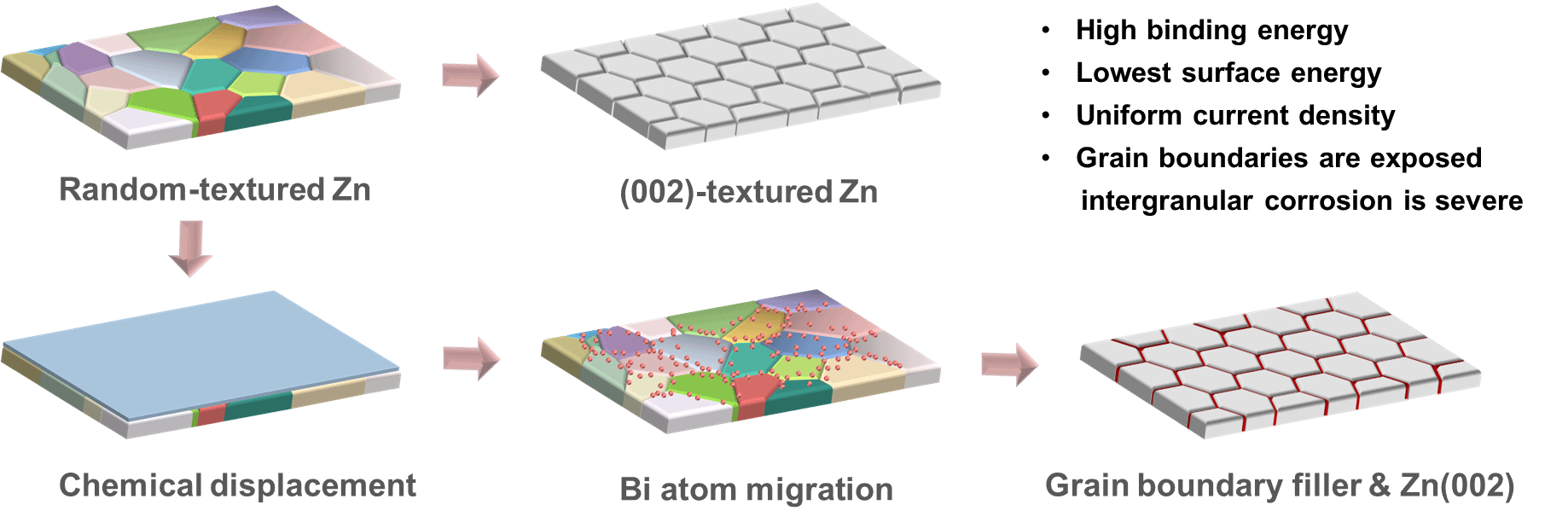 水系锌离子电池因其本征安全、环境友好和成本低廉等优势,使其成为大规模可再生能源存储的有力候选者。然而,不可控的枝晶生长和界面副反应严重阻碍了其商业化进程。研究表明,构建以(002)晶面为主的织构锌负极能有效提升其可逆性和稳定性,这归因于(002)晶面具有原子级平整表面和均匀的电流分布,且表面能最低。但即使实现了(002)织构,其晶界区域的高反应活性仍会加剧副反应,一旦反应开始就可沿晶界向材料内部扩展,导致严重的晶间腐蚀,最终破坏锌沉积/剥离的均匀性。因此,在调控晶面取向的同时,如何钝化并强化晶界,成为提升(002)织构锌负极电化学性能,特别是高倍率长循环稳定性的关键科学问题。