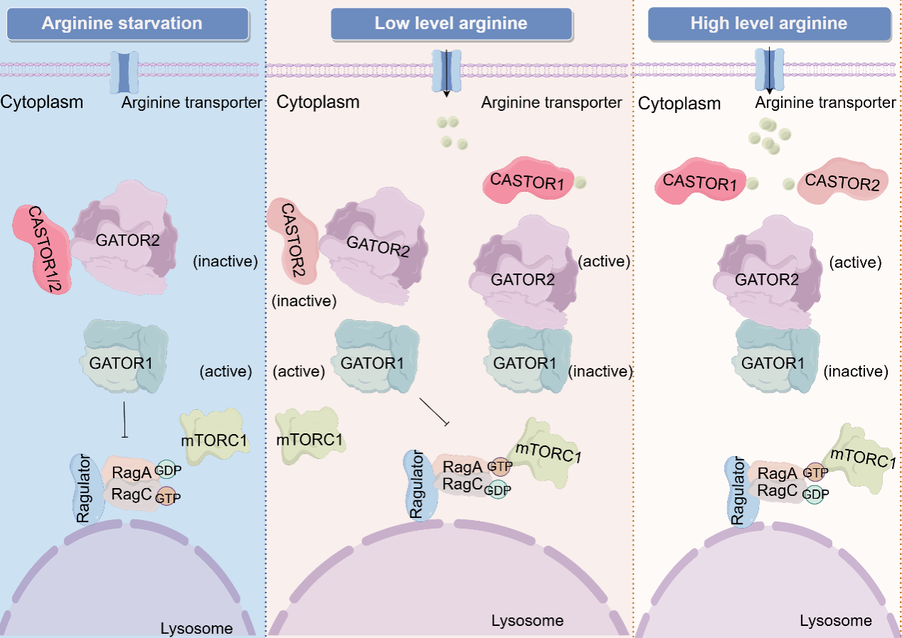 图1. CASTOR1/2的作用机制示意图。当精氨酸缺乏时,CASTOR1和CASTOR2分别结合GATOR2复合物,抑制GATOR2与GATOR1的相互作用,GATOR1发挥GAP活性,抑制下游Rag小G蛋白与mTORC1的相互作用,从而抑制mTORC1活性;当营养充足时,CASTOR1和CASTOR2分别响应低浓度和高浓度的精氨酸,从GATOR2解离,进而GATOR2抑制GATOR1活性,促进mTORC1与Rag小G蛋白结合定位在溶酶体上,激活mTORC1信号通路。