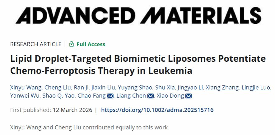 Xinyu Wang, Cheng Liu, Ran Ji, Jiaxin Liu, Yuyang Shao, Shu Xia, Jingyao Li, Xiang Zhang,LingjieLuo,YanweiWu, Shao Q. Yao, Chao Fang, Liang Chen, Xiao Dong, Lipid Droplet-Targeted Biomimetic Liposomes Potentiate Chemo-Ferroptosis Therapyin Leukemia. Adv. Mater. 2026, 38, e15716.