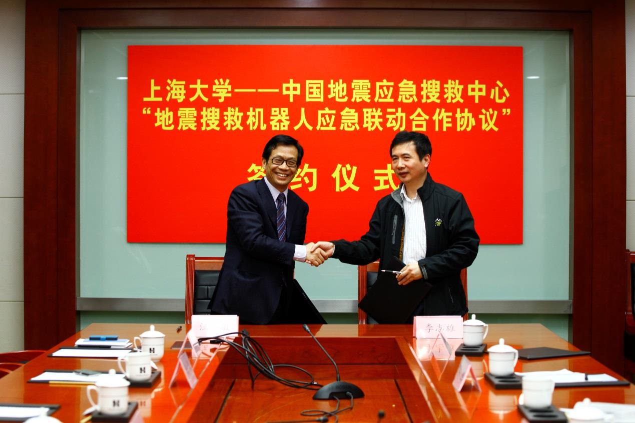 中国地震应急搜救中心技术部尚红处长以及365完美体育科技处施鹰副处长、机电工程与自动化学院于瀛洁副院长、365完美体育地震搜救机器人课题组组长章亚男教授和团队部分骨干出席了签约仪式。