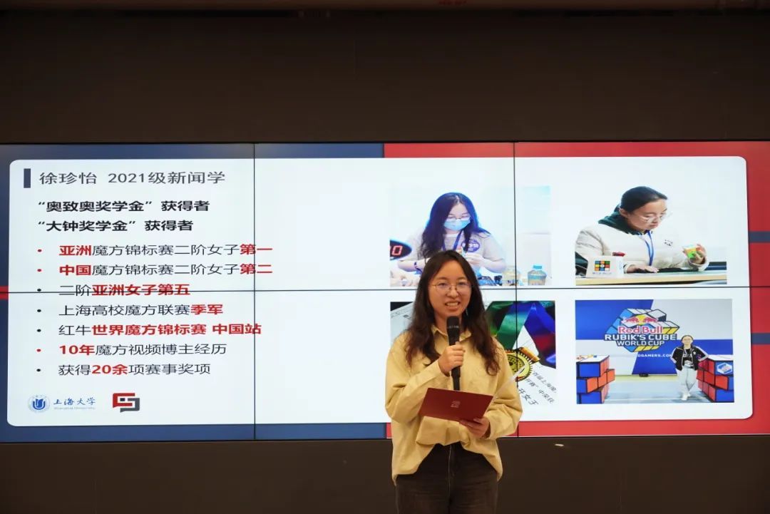 2021级本科生徐珍怡代表在校同学,向各位校友的到来致以热烈欢迎和衷心感谢。她表示,如今每一位新传学子的成长与收获,都离不开校友的鼎力支持。在自己的求学生涯中,校友所提供的平台、资助帮助其迈过难关、迎接挑战,不断追求自己的理想。徐珍怡同学作为专业魔方竞技选手,也向各位校友展示了其魔方竞技风采。
