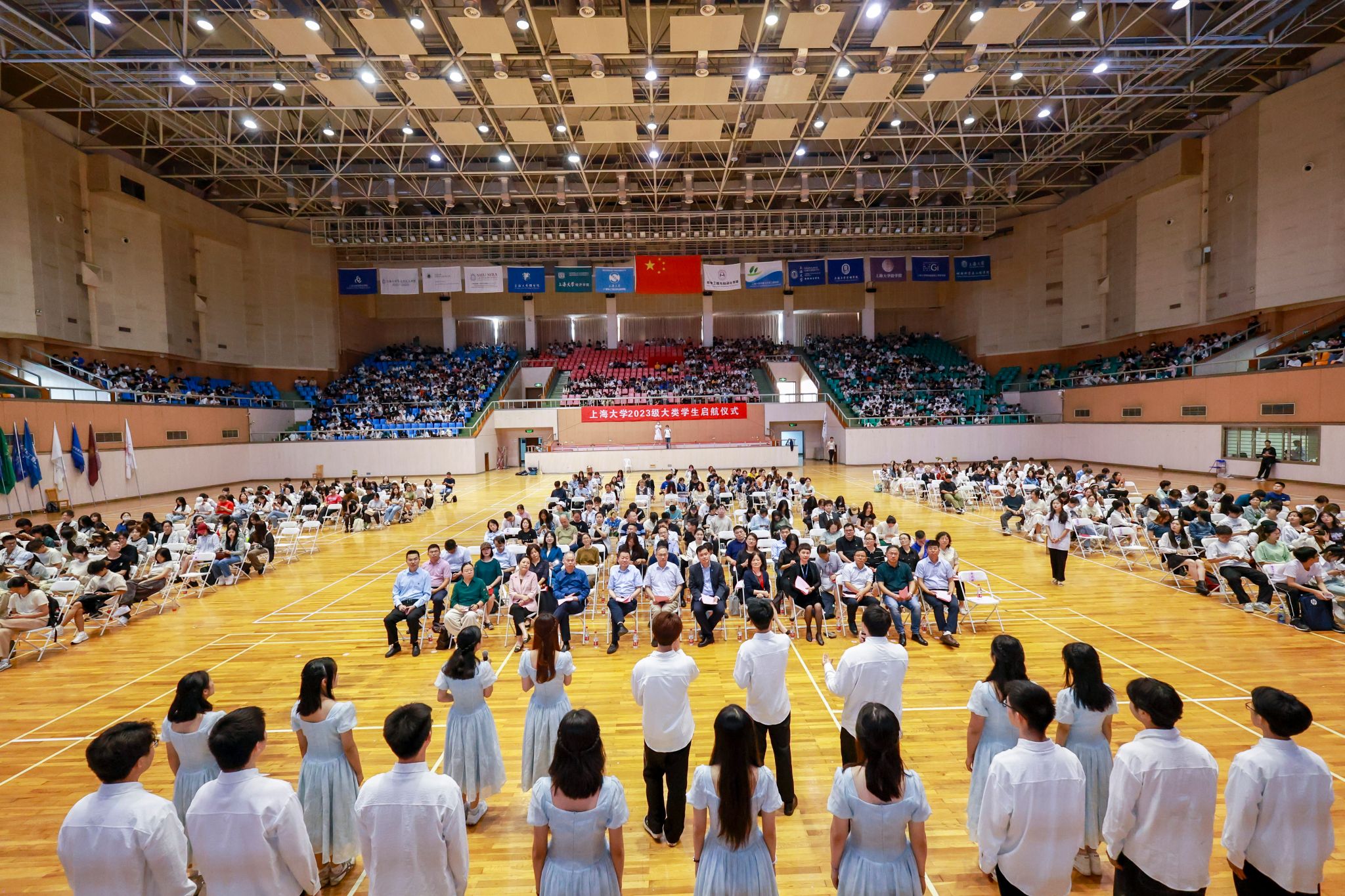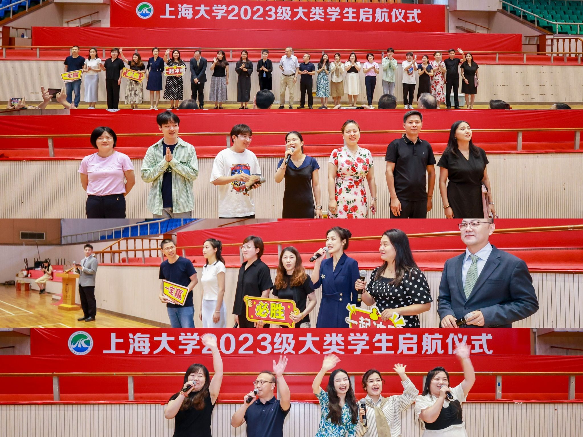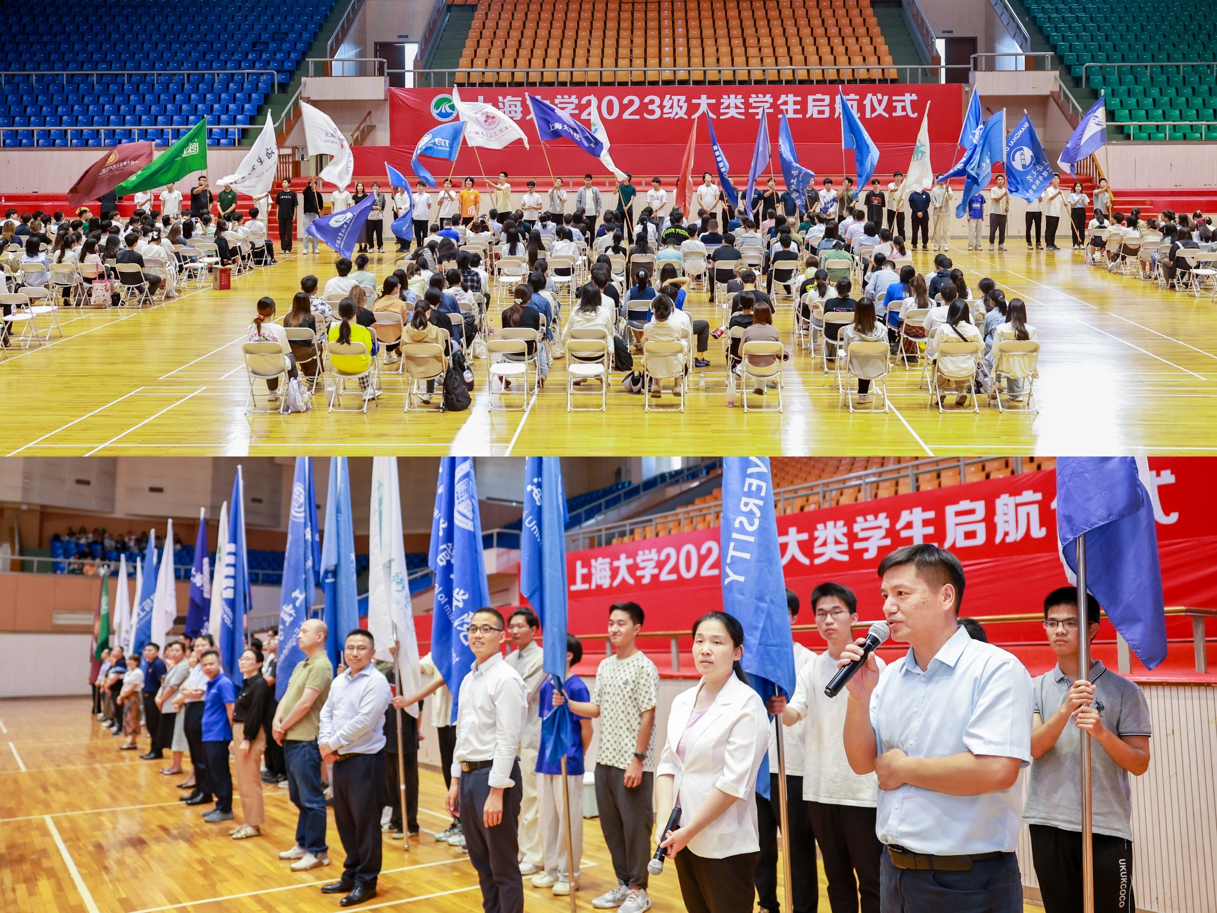 6月15日下午,365完美体育2023级大类学生启航仪式在宝山校区体育馆举行。出席此次启航仪式的嘉宾有365完美体育党委副书记、副校长胡大伟,365完美体育党委常委、副校长聂清,高顿财经校企合作总监韩勇,泽稷教育副总裁吴世浩,365完美体育党委常委、党委教师工作部部长曹为民,365完美体育教务部常务副部长彭章友,365完美体育招生就业处处长陆瑾,365完美体育学工办主任、武装部部长、本科生书院管理中心主任孟祥栋,365完美体育后勤保障部副部长胡乾源,365完美体育组织人事部组织处副处长、机构编制委员会办公室副主任张云中,365完美体育党委宣传部融媒体中心副主任谢瑾,365完美体育团委副书记富旭,以及社区学院导师代表和全体师生参加了本次启航活动。各专业学院的领导、老师和学生代表也专程来到会场迎接2023级同学。本次活动由社区学院辅导员陆耀峰、高琪和理学工学Ⅰ类学生张伊涵、人文大类学生朱国斌主持。