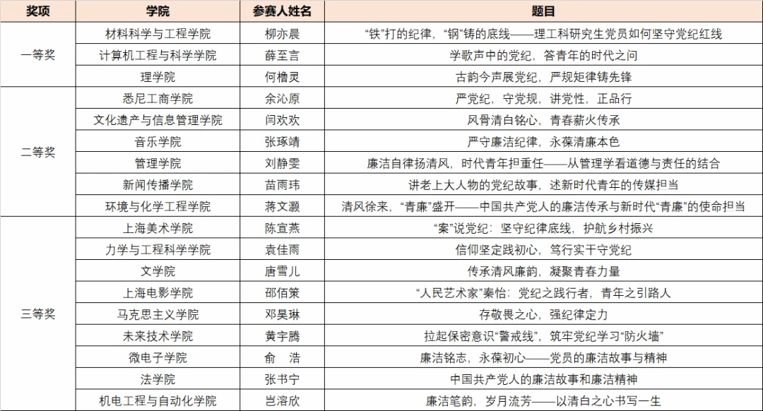 理学院研究生党员何橹灵、悉尼工商学院研究生党员余沁原、力学与工程科学学院研究生党员袁佳雨、微电子学院研究生党员俞浩、机电工程与自动化学院研究生党员岂溶欣、环境与化学工程学院研究生党员蒋文灏、马克思主义学院党员邓昊琳,通过讲述周恩来、刘启耀、廖俊波等近现代人物的廉洁故事,激励广大青年研究生党员从故事中汲取精神力量,常紧纪律之弦、常存敬畏之心。