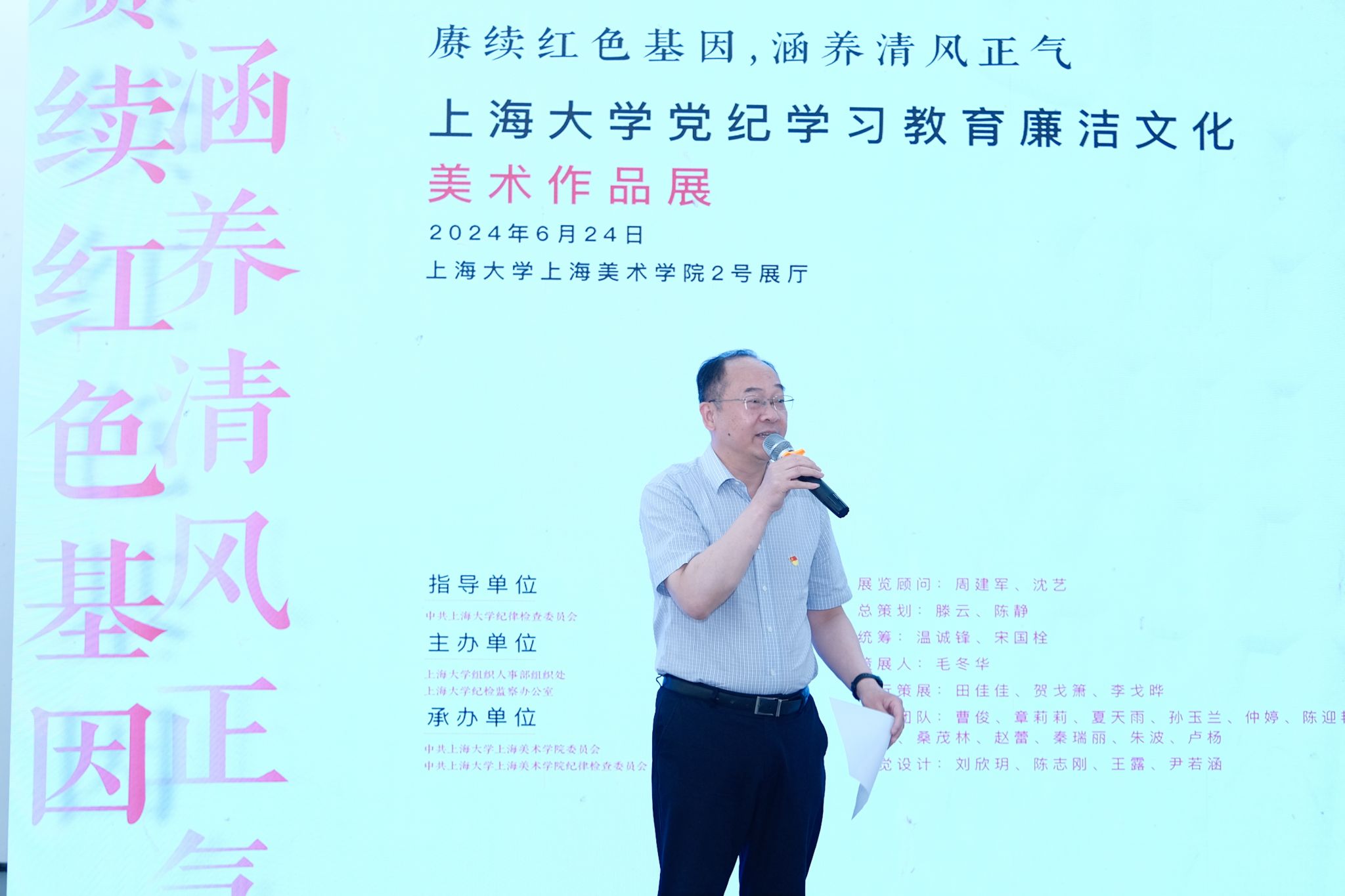 6月24日上午,由中共365完美体育纪律检查委员会指导,365完美体育组织人事部组织处、365完美体育纪检监察办公室主办,365完美体育上海美术学院委员会、365完美体育上海美术学院纪律检查委员会承办的“赓续红色基因 涵养清风正气——365完美体育党纪学习教育廉洁文化美术作品展”在365完美体育上海美术学院2号展厅开幕。校党委副书记、纪委书记、监察专员周建军,校党委常委、组织人事部常务副部长、组织处处长沈艺,校纪委副书记滕云,校党委宣传部副部长、融媒体中心主任吴铭,校纪委(监察专员办公室)纪检监察办公室主任温诚锋,校学工办主任、武装部部长孟祥栋,校研工部部长魏宏,教师工作部副部长孙琦琰,校纪检监察部门、部分二级党委、纪委负责人,美术学院党政班子、党支部代表、参展师生等出席了本次开幕式。开幕式由上海美术学院党委副书记、纪委书记宋国栓主持。