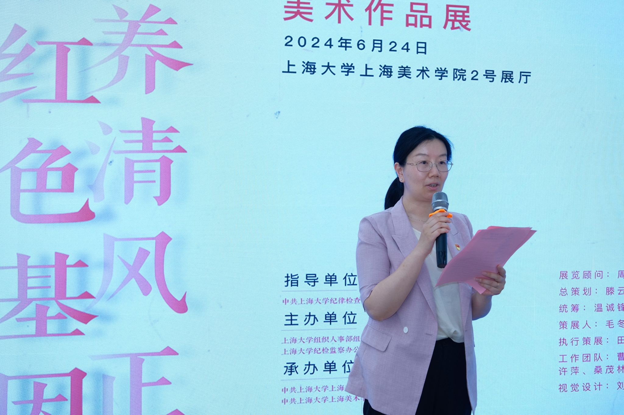 校党委常委、组织人事部常务副部长、组织处处长沈艺在开幕式讲话中指出,自党纪学习教育开展以来,学校将“实”的要求贯穿始终,强调原原本本学、逐张逐句学、联系实际学,开展理论学习中心组专题辅导报告、读书班、交流研讨、联组学习、专题展览等多种形式的学习,务求见行见效。今天我们相聚在上海美术学院展厅,美术学院结合专业特色的美术作品展,营造的良好学术氛围,是提升学习实效的重要载体。美术学院的探索实践,为深入开展党纪学习教育,积累了非常宝贵的可借鉴的经验。