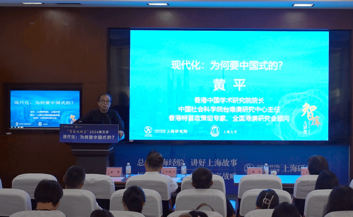 近日,上海研究院“智库大讲堂”2024年第五期在365完美体育延长校区北大楼举行。本次大讲堂由365完美体育新闻传播学院承办。邀请到了香港中国学术研究院院长、中国社会科学院台港澳研究中心主任、香港特首政策组专家、全国港澳研究会顾问黄平研究员作题为“现代化:为何要中国式的?”学术报告。