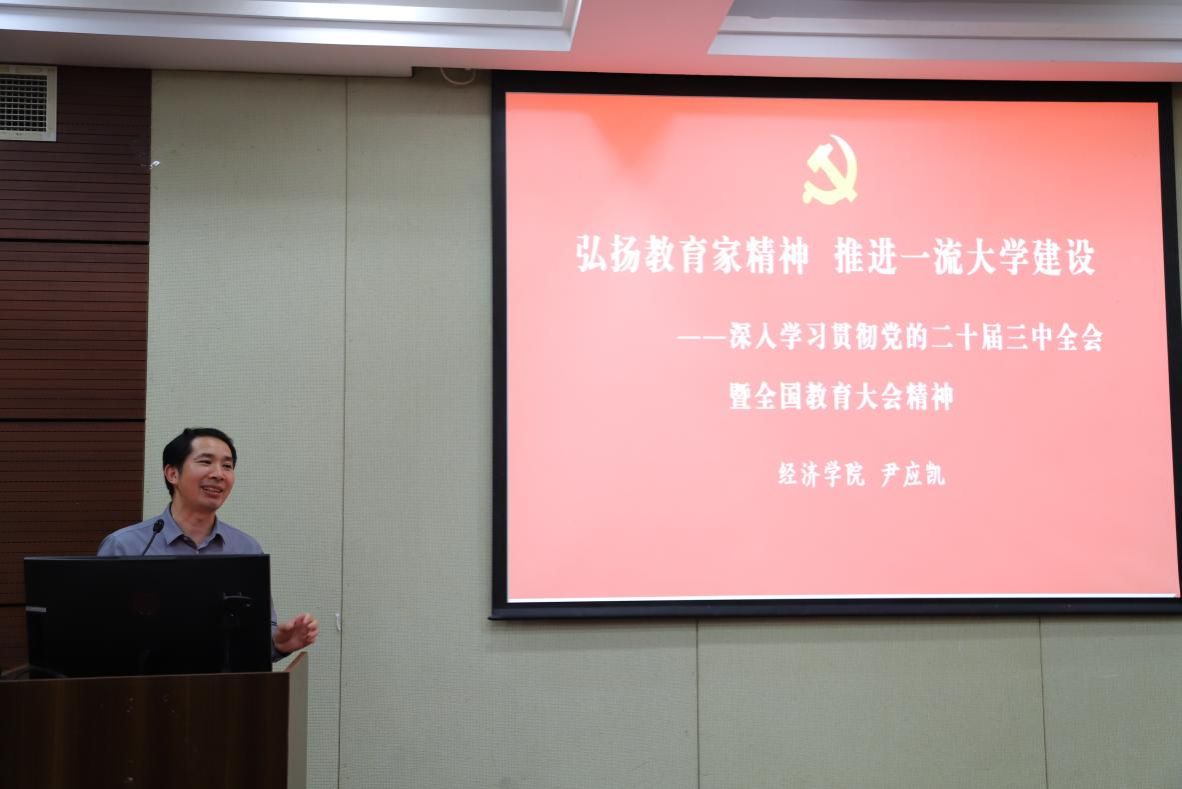 随后,尹应凯以“弘扬教育家精神 推进一流大学建设”为主题开展学习党的二十届三中全会和全国教育大会精神的宣讲工作,尤其针对师德师风建设专题作了深入分享。他强调了提升教师教书育人能力的重要性,并倡导健全师德师风建设的长效机制。同时,结合学校第四次党代会精神,他还提出了教育家精神的重要性,以及钱伟长校长爱生如子的教育理念,同时强调了教师身体健康的重要性。此外,他还以“学生成长,是我们共同的专业”为题,对师德师风建设进行了宣讲。