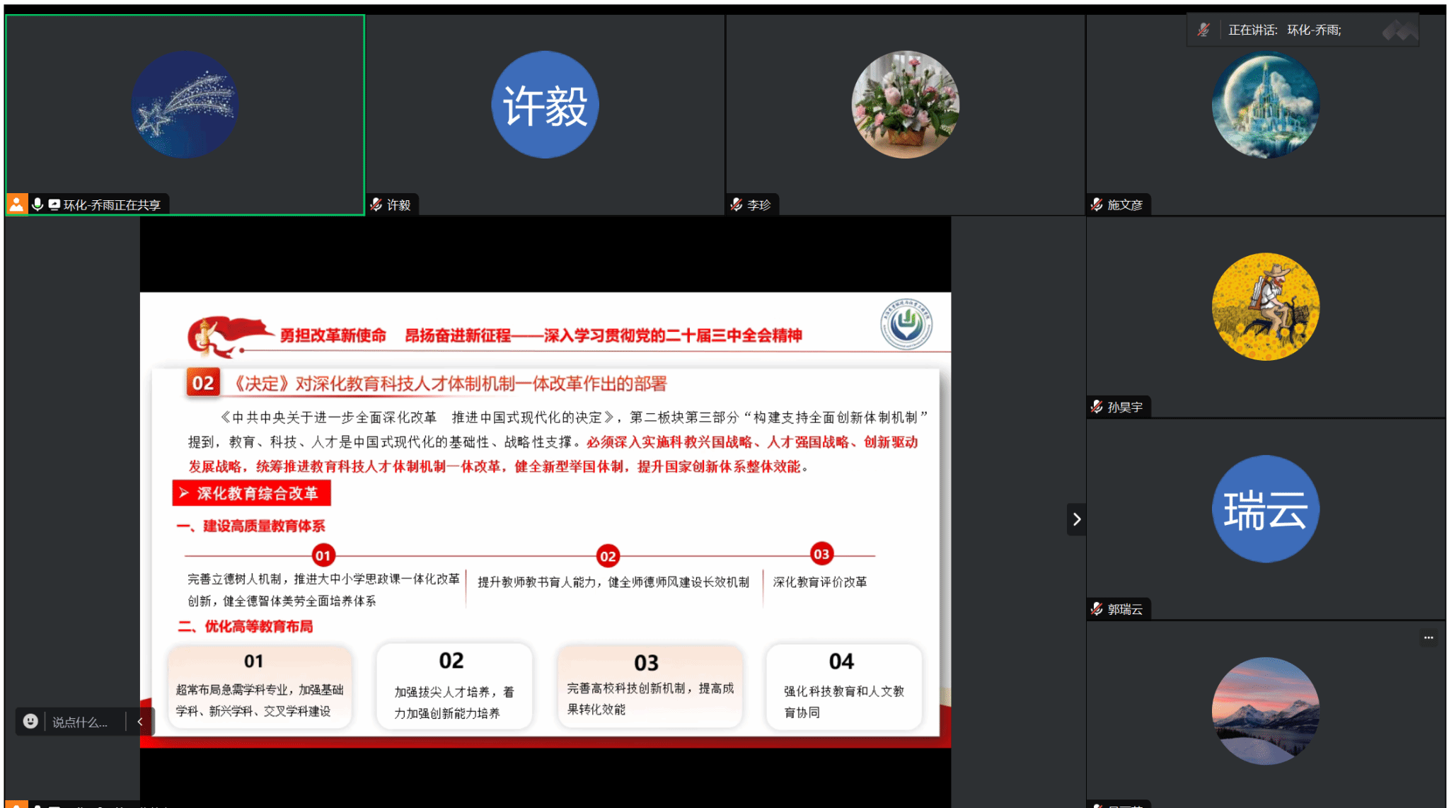 结合党的二十届三中全会精神、全国教育大会会议精神、习近平总书记近期关于生态文明建设的重要讲话精神、校第四次党代会精神等内容,钱冬英围绕“提高人才培养质量”“全力助推学科建设”“潜心科研创新”及“提升自身素质”四个方面,通过列举具体的工作实例与工作方法,向与会教师分析了新征程上应如何积极投身到改革实践中去,推动高校教育、科技、人才事业的蓬勃发展。钱冬英强调,全体党员要深入学习贯彻党的二十届三中全会精神,做到学用结合、知行合一,努力将学习成果转化为推动工作创新发展的强大动力,以更加饱满的热情、更加务实的作风,为学校高质量发展、为推进中国式现代化贡献自己的力量。