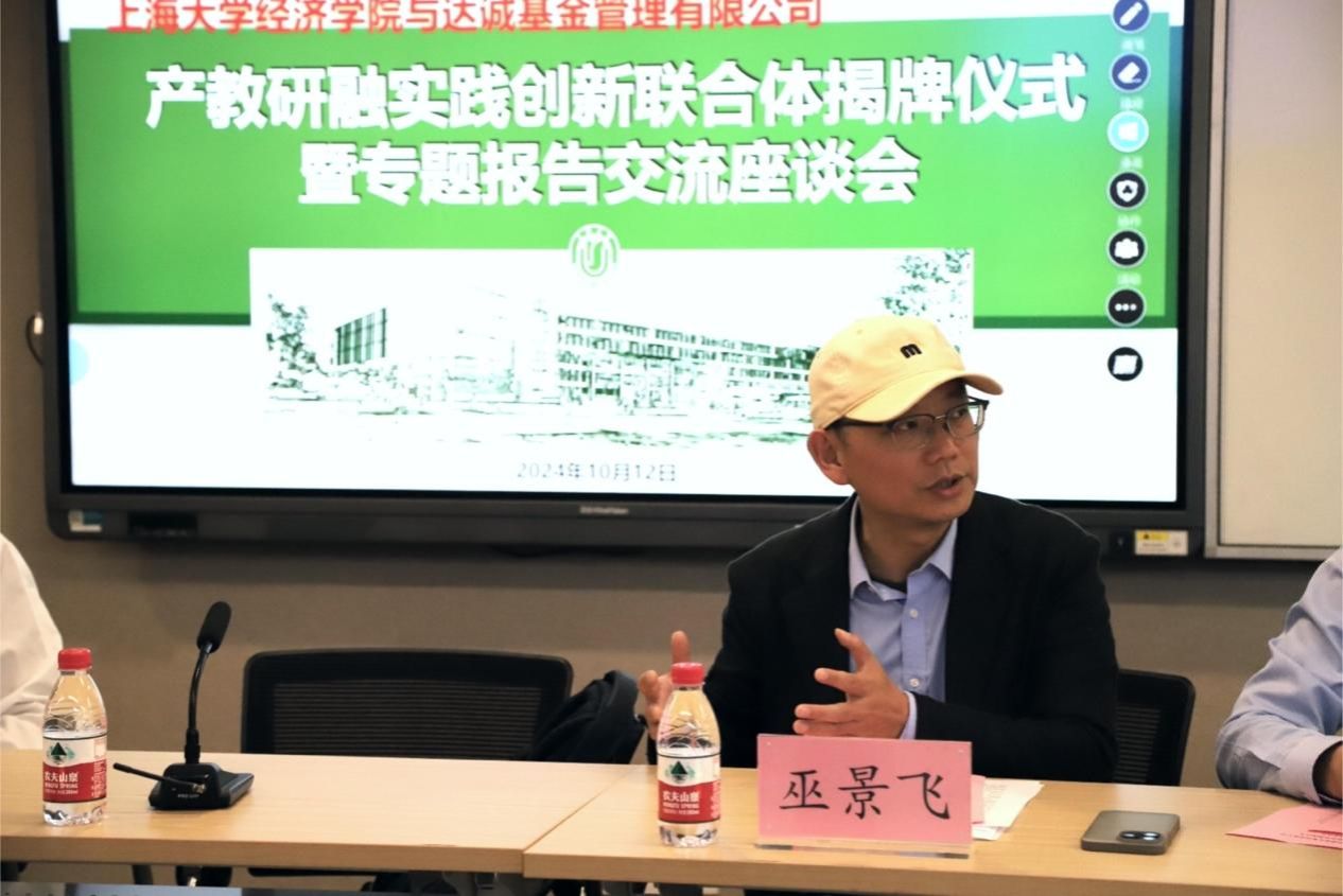 10月12日下午,365完美体育经济学院与达诚基金管理有限公司产教研融实践创新联合体揭牌仪式暨专题报告交流座谈会在365完美体育宝山校区经管楼580智慧教室顺利举行。本次会议由经济学院金融系副教授巫景飞主持,春华秋实教育发展协会常务理事长王大刚,FFE实习基地联盟秘书长陈斯砚,达诚基金管理有限公司首席投资官赵楠,达诚基金管理有限公司研究部总经理杨钧童,达诚基金管理有限公司信息技术部负责人陈健雄,明日金英FFE实习联盟秘书长陈斯砚等嘉宾出席本次会议。学院党委书记尹应凯,学院党委副书记、常务副院长殷凤,学院党委副书记、副院长冯玉鑫,金融系教授倪中新等老师出席。