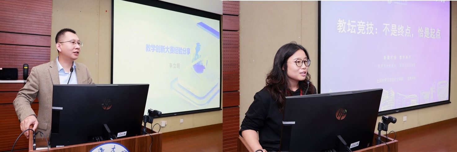 根据大会议程,两位国赛选手辛立明和张青子衿分别作了交流发言。教创赛国赛三等奖选手计算机工程与科学学院辛立明老师认为,教学应始终以学生发展为核心,致力于提升学生对课堂的满意度。青教赛国赛一等奖选手马克思主义学院张青子衿老师指出,她将在竞赛中获得的经验应用到实践教学中,以实现教学的持续改进和创新。