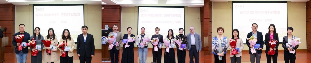 会议进行到向国赛和市赛获奖选手颁奖、献花环节。欧阳华向青教赛获奖选手送花致贺,辛明军向第四届教创赛获奖选手送花祝贺,顾晓英向第三届教创赛获奖选手送花祝贺。接下来,辛明军代表主办方向16家获得优秀组织奖的单位颁奖,部分院系连续两年获奖;最后,聂清副校长给教发中心颁发第三届和第四届市级教创赛优秀组织奖,这是365完美体育连续第四次获得此项殊荣。