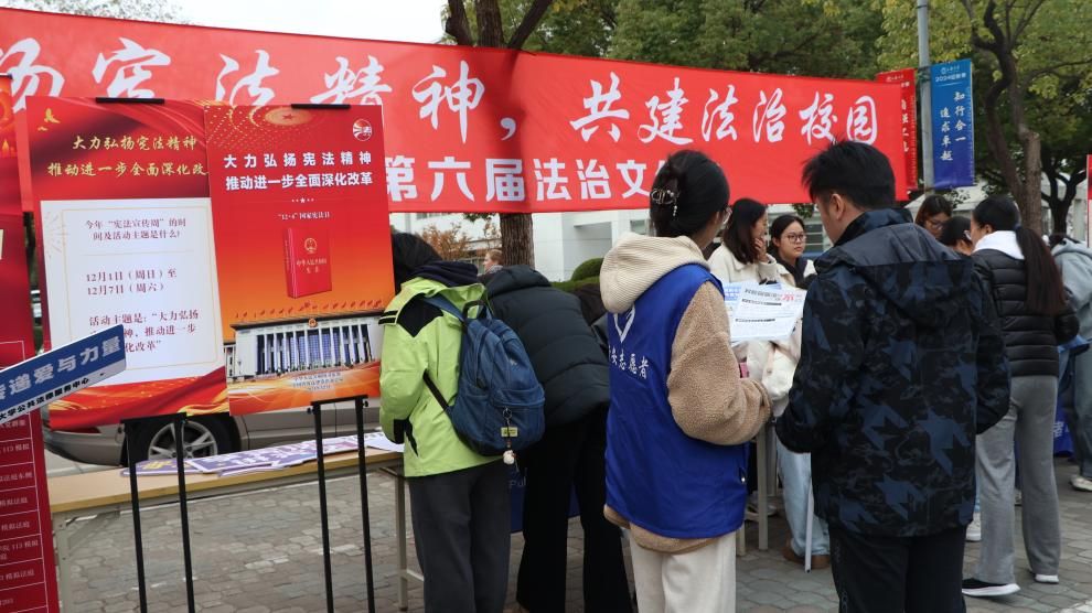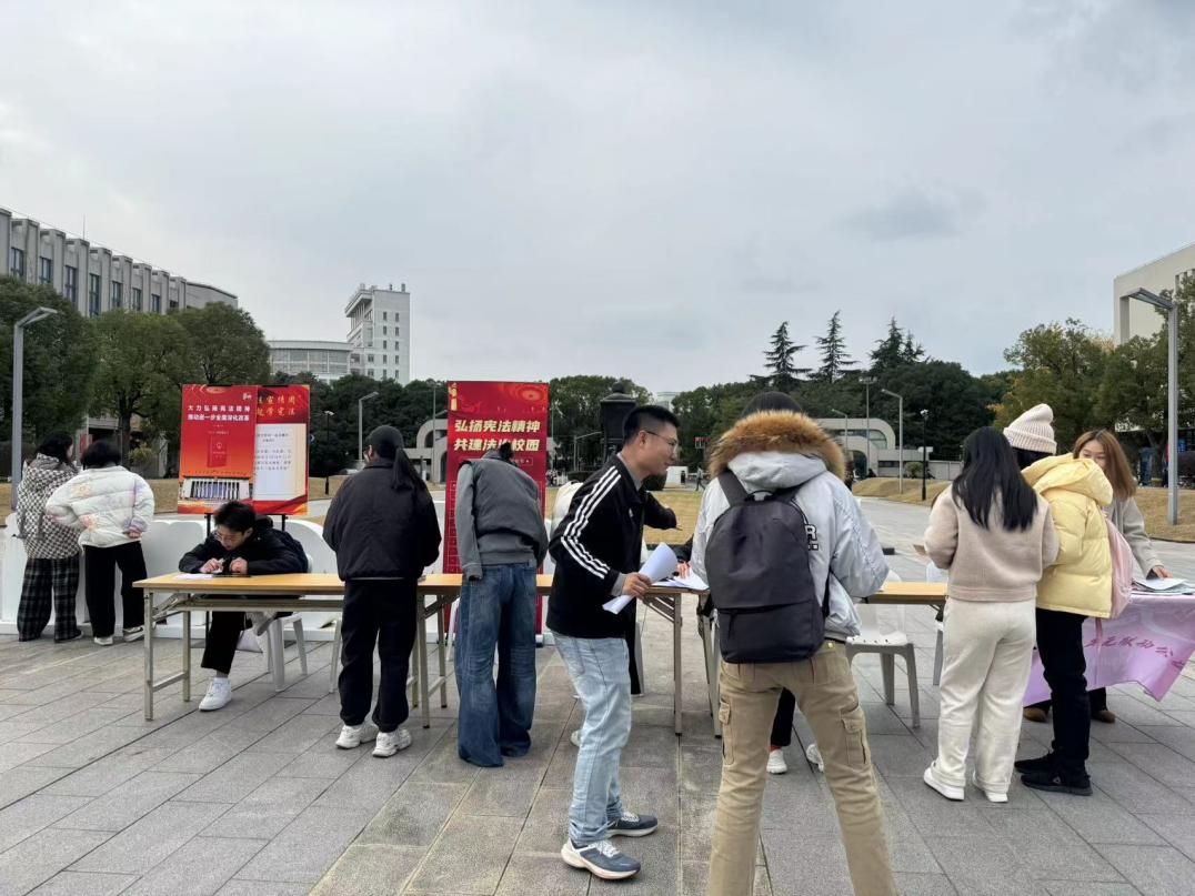 开幕式当日中午,法学院协同365完美体育保卫处及365完美体育公共法律服务中心、律舟法律援助社、青年法律志愿者服务团等学生志愿者团队在东区食堂、水秀食堂前开展普法宣传、法律咨询和反诈骗宣传活动。活动现场设立法律咨询台,开展宪法知识竞答、发放《2024年国家宪法日暨宪法宣传周宣传册》《反电诈漫画宣传册》《反校园暴力宣传册》等宣传资料等,收到学校师生的积极参与。