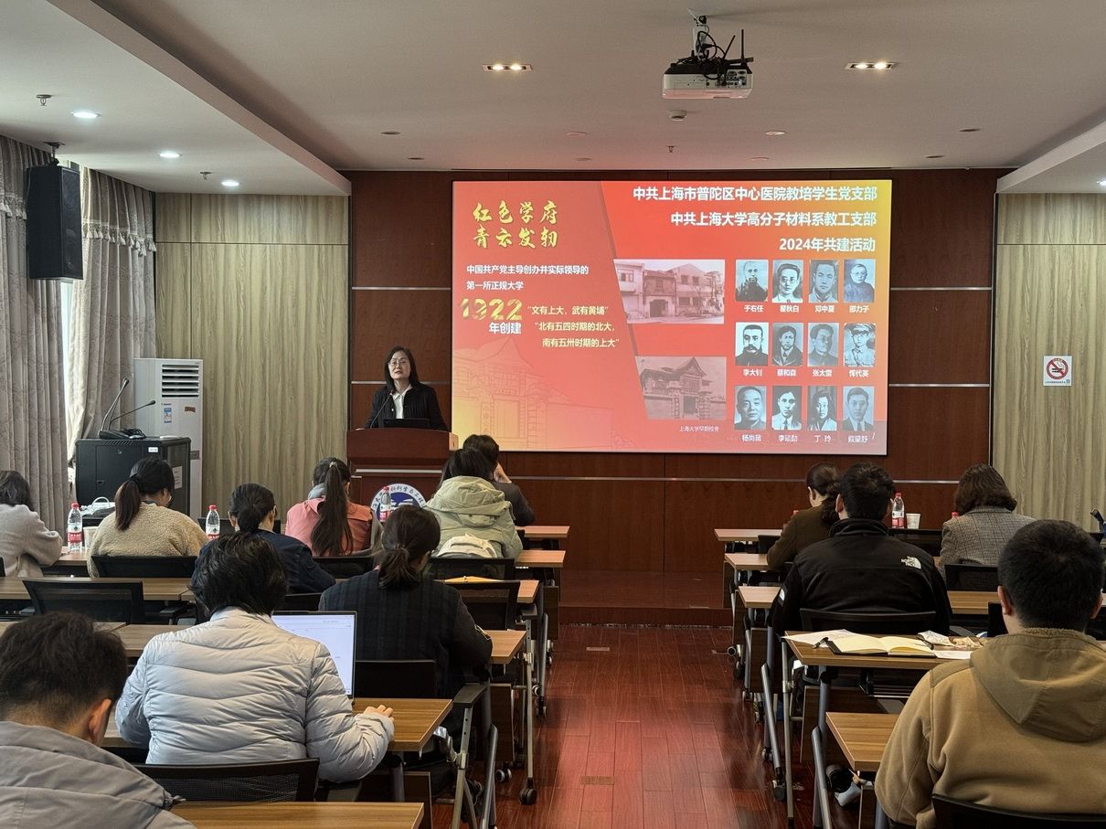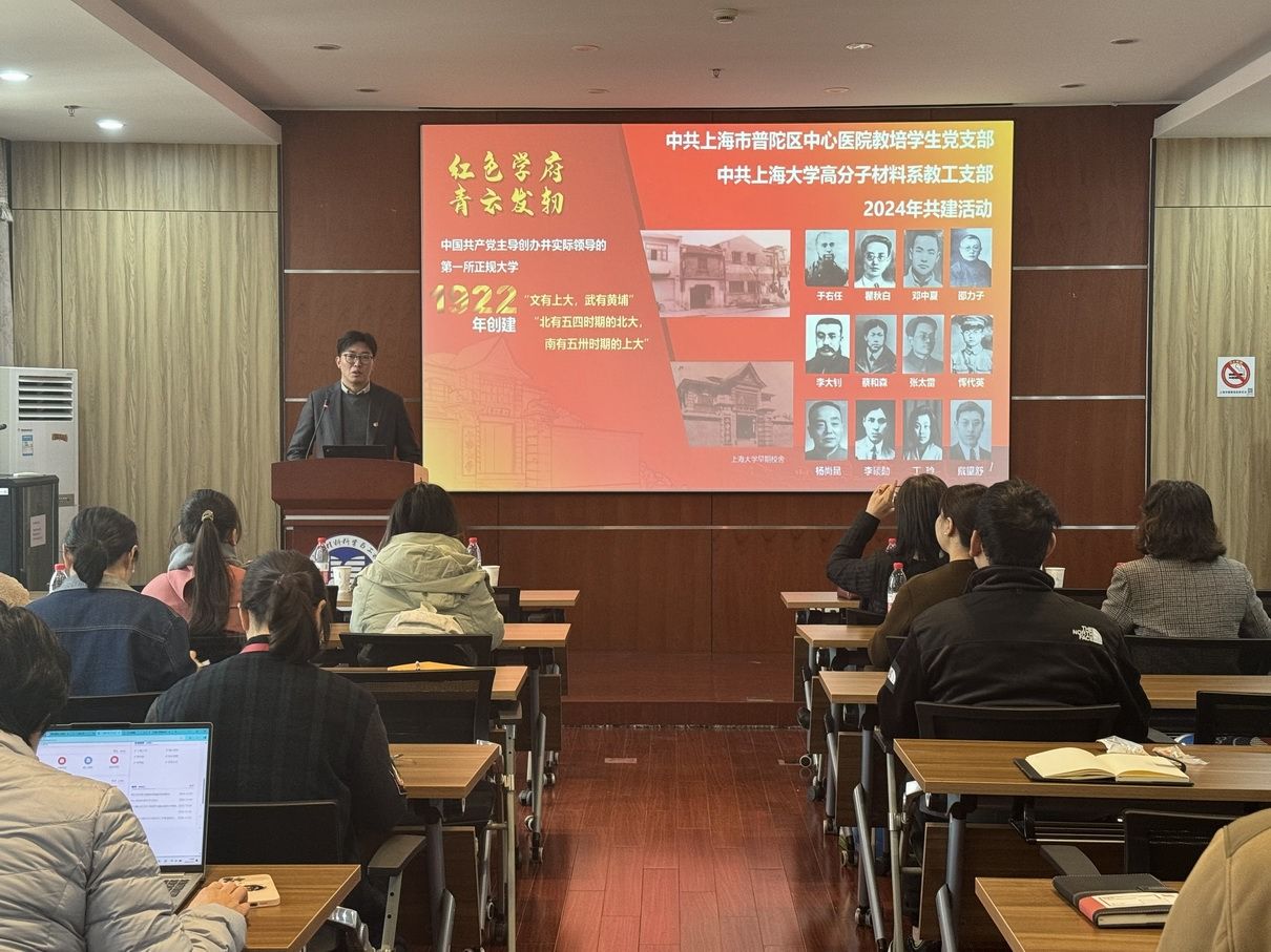 12月5日下午,材料学院高分子材料系教工党支部与普陀区中心医院教培学生党支部开展“支部共建聚合力 校医融合促发展”主题党日,此次是高分子系教工党支部与普陀区中心医院科教党支部结对共建的系列活动。出席本次活动的有普陀区中心医院教培学生党支部书记、资产管理部主任、上海市名中医范忠泽工作室负责人石晓兰,宣传委员曹婉玉,纪检委员赵琼,高分子材料系教工党支部书记张坤玺,组织委员张述华以及双方师生代表。活动由高分子材料系教工党支部书记张坤玺主持。