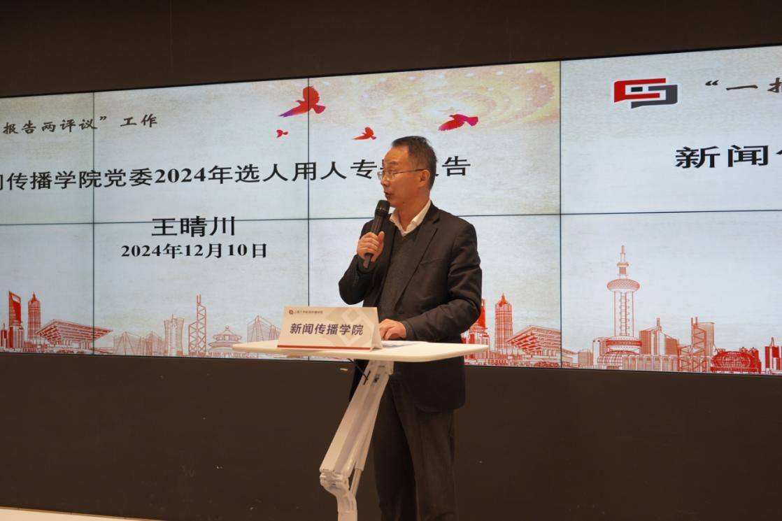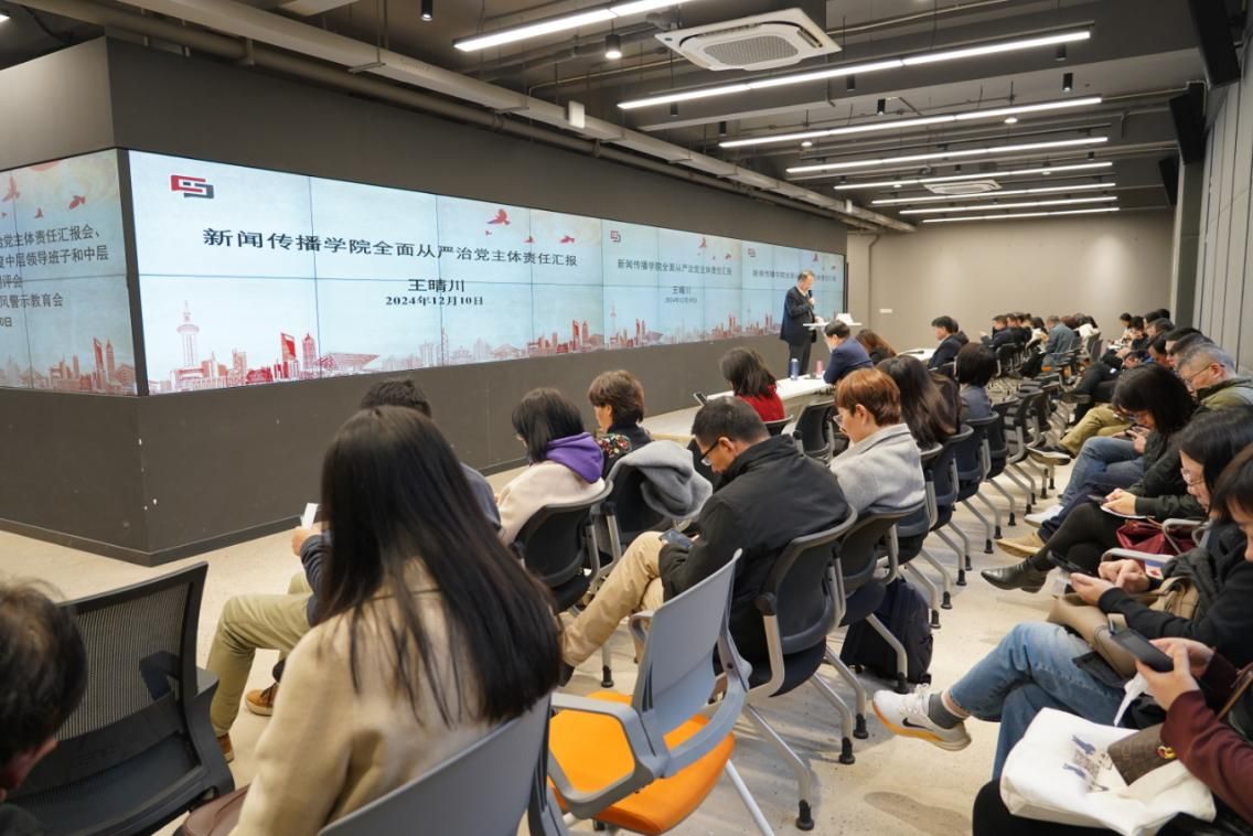 新闻传播学院党委书记王晴川作新闻传播学院党委落实全面从严治党主体责任工作汇报。王晴川同志对新闻传播学院党委在2024年度履行管党治党主体责任、落实意识形态主体责任和抓好基层党建工作等方面内容进行了总结,并聚焦2024年度的工作成果与经验深入剖析了当前工作中存在的问题,明确指出未来的改进重点及下一步工作计划。在过去一年里,学院建设和发展在各方面取得了丰硕的成果。新闻传播学院党委将继续提高政治站位,深入学习贯彻落实党的二十届三中全会精神,攻坚克难,真抓实干,推动学院持续向好向前发展。